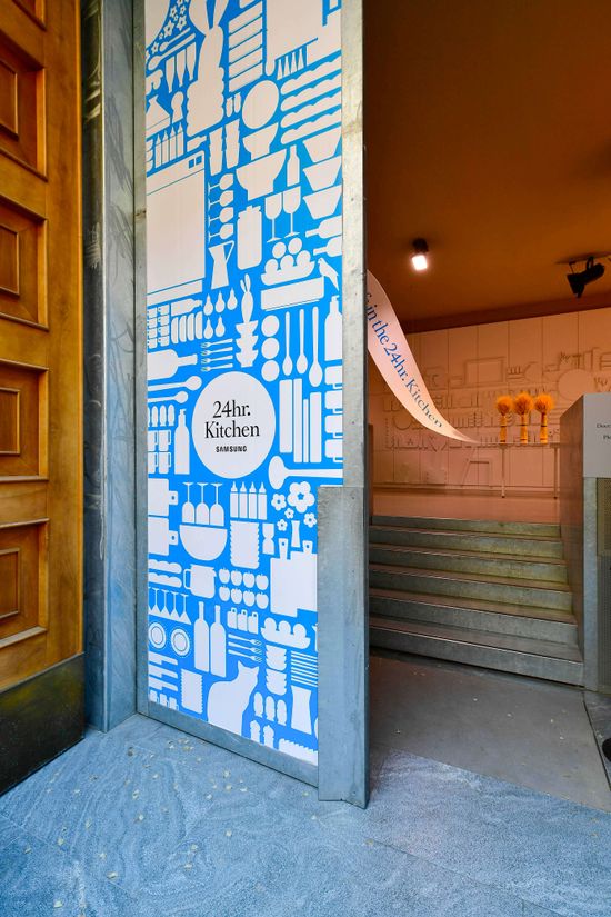 "alt": "Wejście do pawilonu Samsung podczas Milan Design Week",