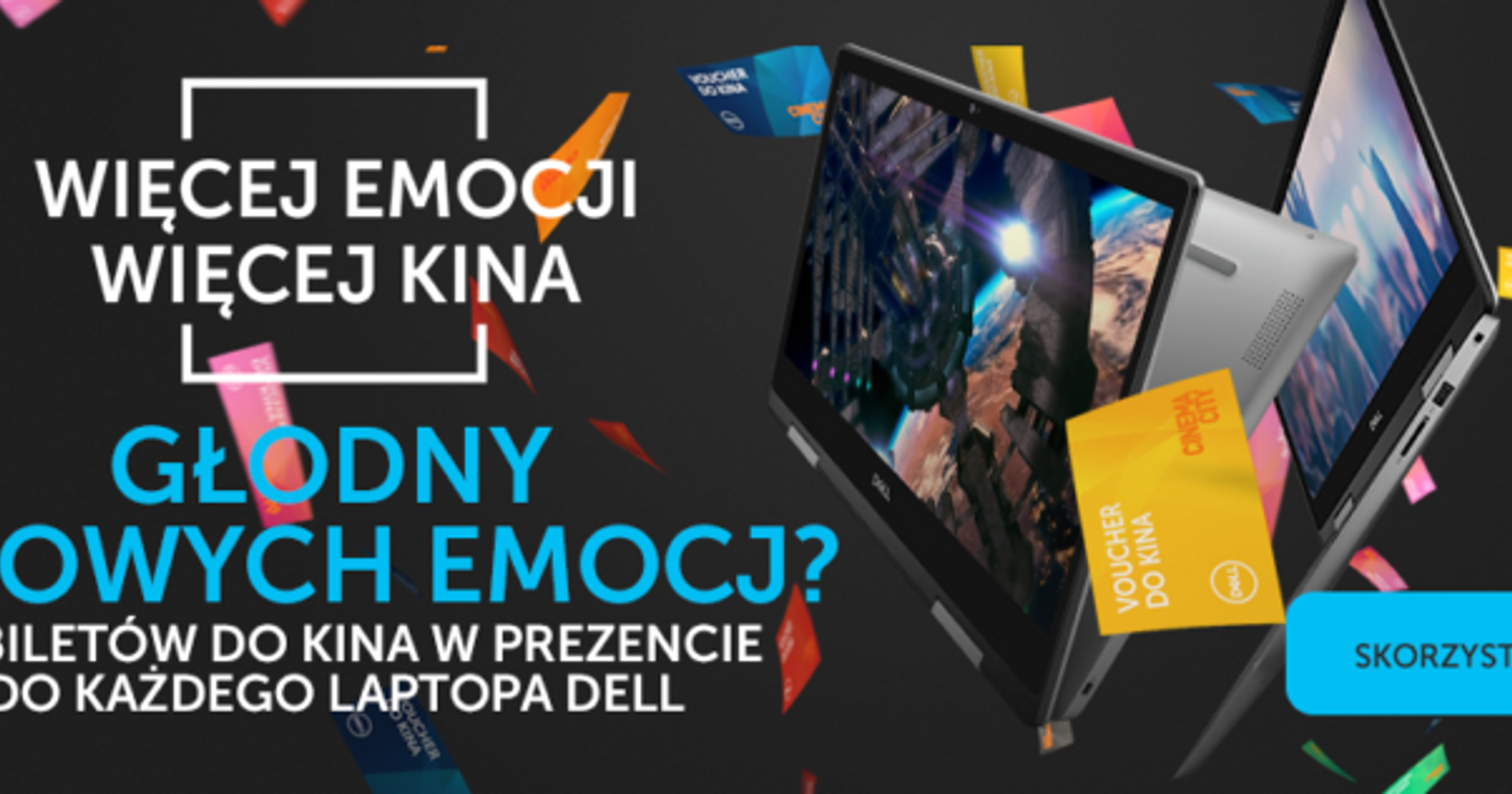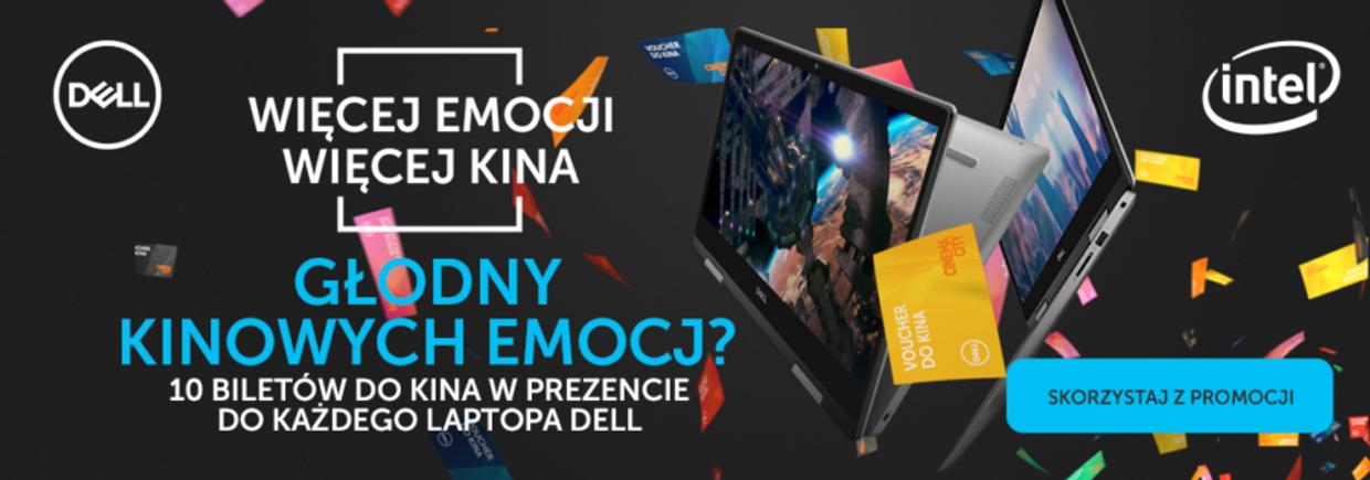 "content": "<p>Głodny kinowych emocji? Weź udział w najnowszej promocji Dell „Więcej Emocji Więcej Kina”. Teraz kupując dowolnego laptopa Dell lub Alienware z procesorem Intel®, dostajesz w prezencie aż 10 voucherów do Cinema City w swoim ulubionym kolorze.<a href=\"https://wiecejemocjiwiecejkina.pl/\"> Sprawdź szczegóły >></a></p>",