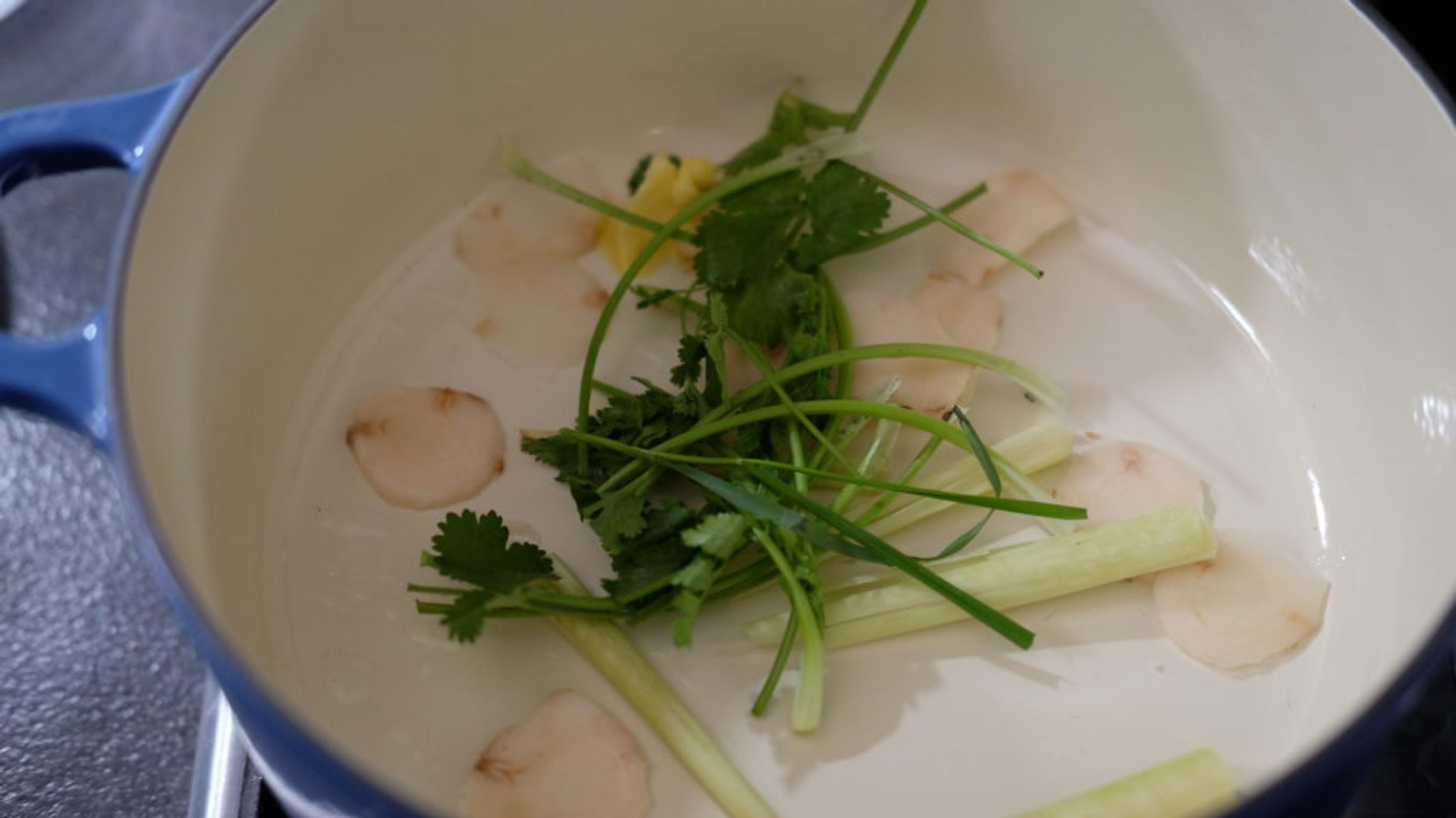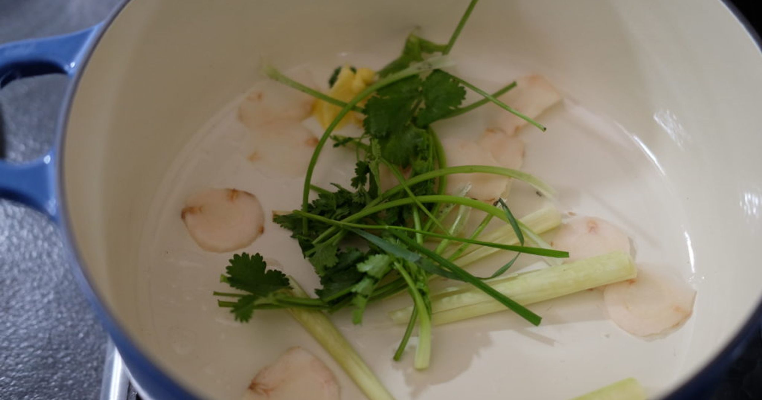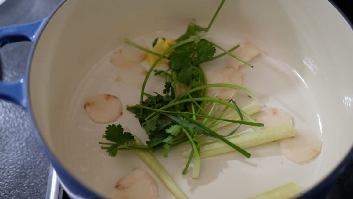 "first_paragraph": "<p>Tom kha gai to aromatyczna i kojąca tajska zupa z kurczakiem i mleczkiem kokosowym. W poniższym artykule postaram się opisać najważniejsze jej elementy oraz sposoby, dzięki którym będziemy mogli dostosować jej smak, aromat oraz konsystencję do naszych upodobań.</p>\n<h2><strong>Jak przygotować bulion z kurczaka na zupę tom kha gai?</strong></h2>\n<p>Protokół <strong>przygotowania wywaru</strong> <strong>będącego podstawą tom kha gai jest bardzo prosty</strong>, ponieważ nie musimy absolutnie martwić się o to, by był klarowny – do zupy na późniejszych etapach i tak będziemy dodawać mleczko kokosowe. Zdejmuje to z nas obowiązek skrupulatnego regulowania mocy palnika i szumowania oraz przyspiesza gotowanie, ponieważ w buzującym garnku ekstrakcja smaków i aromatów zachodzi znacznie szybciej niż w trakcie powolnego podgrzewania w temperaturze 80-90 stopni. <strong>Mocno gotujący się bulion zazwyczaj mętnieje</strong>, ponieważ ruchy wody spowodowane przez konwekcję oraz uciekające bąbelki pary doprowadzają do częściowej emulgacji tłuszczów z mięsa – zamiast gromadzić się w postaci dużych ok na powierzchni, jak to bywa w przypadku doskonale klarownego rosołu, tłuszcz zostaje rozbity na niewielkie kropelki i rozproszony w całej objętości wywaru, przez co nadaje mu mętny kolor. </p>",