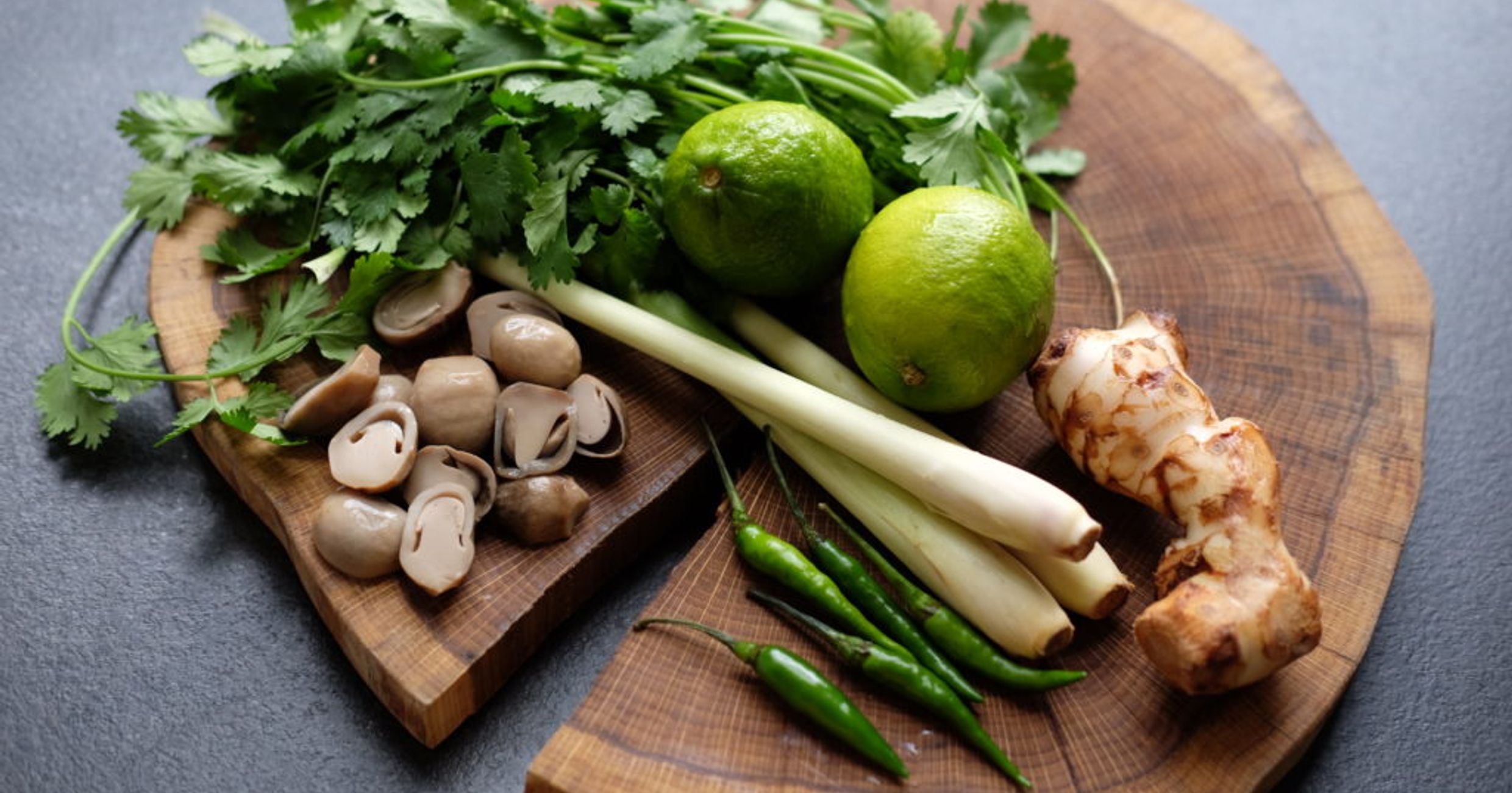 "content": "<ul>\n<li><strong>trawa cytrynowa</strong> 3 źdźbła</li>\n<li><strong>galangal</strong> 6-centymetrowy kawałek</li>\n<li><strong>liście limonki kaffir</strong> 8 świeżych</li>\n<li><strong>bulion</strong> 1 1/4 l (intensywny, drobiowy)</li>\n<li><strong>mleko kokosowe</strong> 750 ml (70%)</li>\n<li><strong>pierś kurczaka</strong> 500 g</li>\n<li><strong>pieczarki</strong> 250 g (niewielkie)</li>\n<li><strong>sok z limonki</strong> do smaku</li>\n<li><strong>sos rybny</strong> do smaku</li>\n<li><strong>chili</strong> świeże (do podania)</li>\n<li><strong>świeża kolendra</strong> świeża (do podania)</li>\n</ul>\n<p><br>Trawę cytrynową miażdżymy, by uwolnić aromat, galangal obieramy i kroimy, liście limonki przerywamy na pół. Wrzucamy do bulionu, zagotowujemy i pozostawiamy na przynajmniej 10 minut, po czym przecedzamy. Dodajemy mleczko kokosowe, wrzucamy pokrojonego w bardzo cienkie kawałki kurczaka i podzielone na pół grzyby. Podgrzewamy do 70 stopni i utrzymujemy tę temperaturę przez przynajmniej 5 minut. Doprawiamy sokiem z limonki i sosem rybnym. Podajemy z chili i kolendrą.</p>",