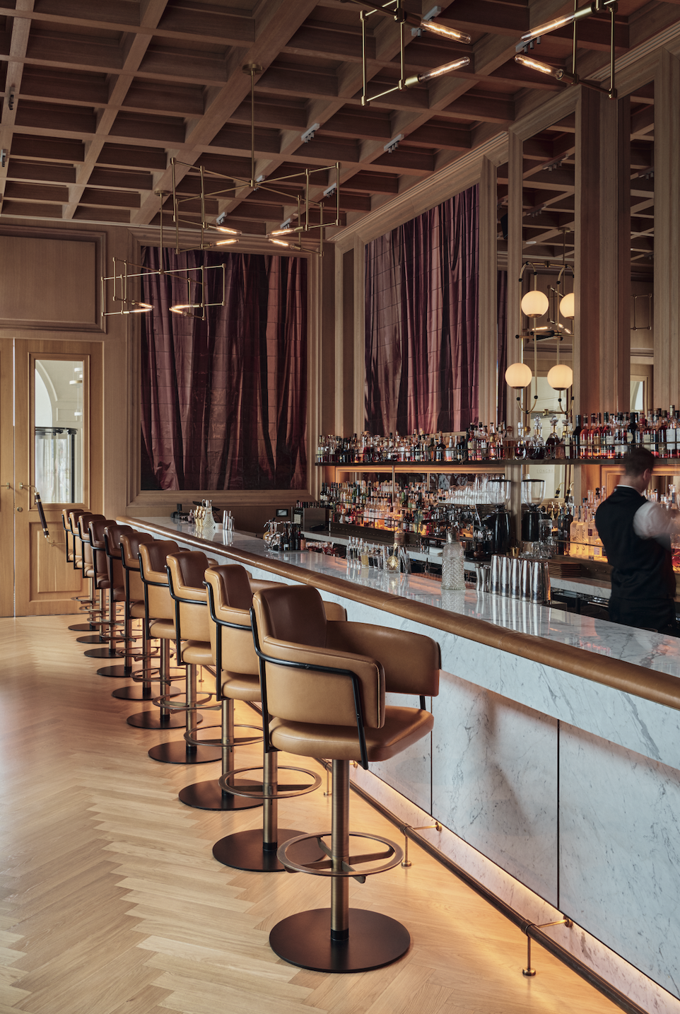 "content": "<h2>Tradycja na nowo: Long Bar (Warszawa)</h2>\n<p>Hotelowe bary kojarzą się z unikatowym klimatem, ale też często z przykurzonym wystrojem i ze staroświeckim menu. Long Bar w warszawskim hotelu Raffles Europejski nie boi się łączyć tradycji z nowoczesnością, a efekt tego mariażu jest elegancki i ponadczasowy.</p>\n<p>Przy projektowaniu tego miejsca Lázaro Rosa-Violán Studio inspirowało się legendarnym barem w Raffles Singapore. To tam powstał koktajl Singapore Sling, którym możemy się raczyć również w stolicy, razem z Warsaw Sling, czyli jego lokalną wersją z dodatkiem syropu piernikowego. Long Bar od - wołuje się do singapurskiego pierwowzoru także poprzez dizajn. Centralnym punktem jest tu długi na 10 metrów bar, przy którym można się wygodnie rozsiąść w karmelowych skórzanych hokerach. Przy podobnym kontuarze w Singapurze spotykali się na początku XX wieku malajscy plantatorzy.</p>",