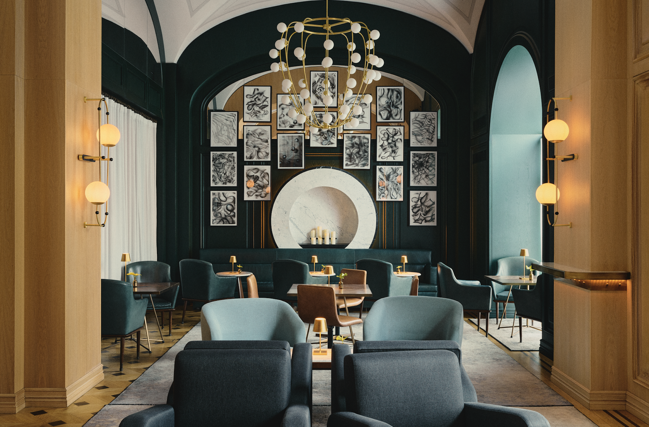 "content": "<p>W wystroju zastosowano między innymi luksusowy marmur z Carrary, który znalazł się zarówno na barze, jak i na nowoczesnym kominku o kolistym kształcie. Złoto i ciepły brąz zyskują kompana w postaci przyga - szonej zieleni w różnych odcieniach. Nie mogło zabrak - nąć sztuki – wykonane z ceramicznych płytek panele ścienne stworzył Jarosław Fliciński, wprawne oko za - uważy tu także niemały zbiór prac Sławomira Pawszaka, które powstały przy użyciu tuszu pigmentowego.</p>",