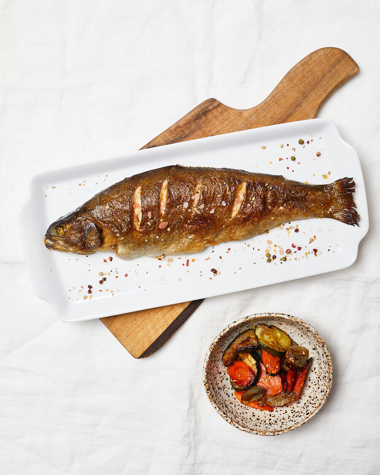 "alt": "pieczony pstrąg, jak upiec pstrąga, pieczona ryba, jak upiec rybę, ryba z warzywami",