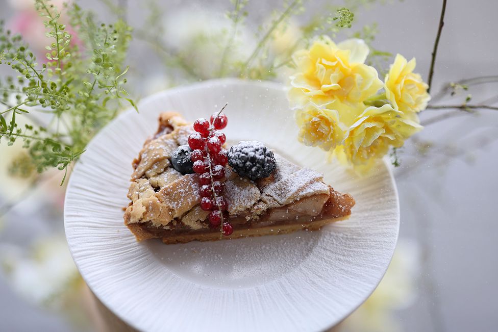 "alt": "pokrojony mazurek z matchą, oraz filiżanka z kawą.",
