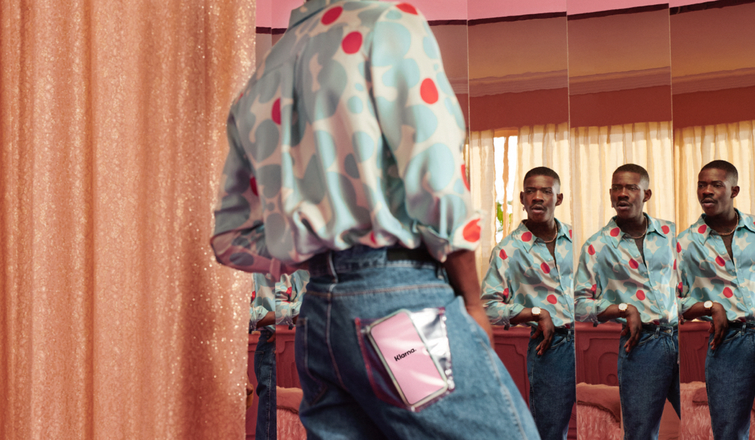"alt": "Klarna. Mężczyzna na zakupach z telefonem komórkowym, przymierzalnia (fot. materiały prasowe)",