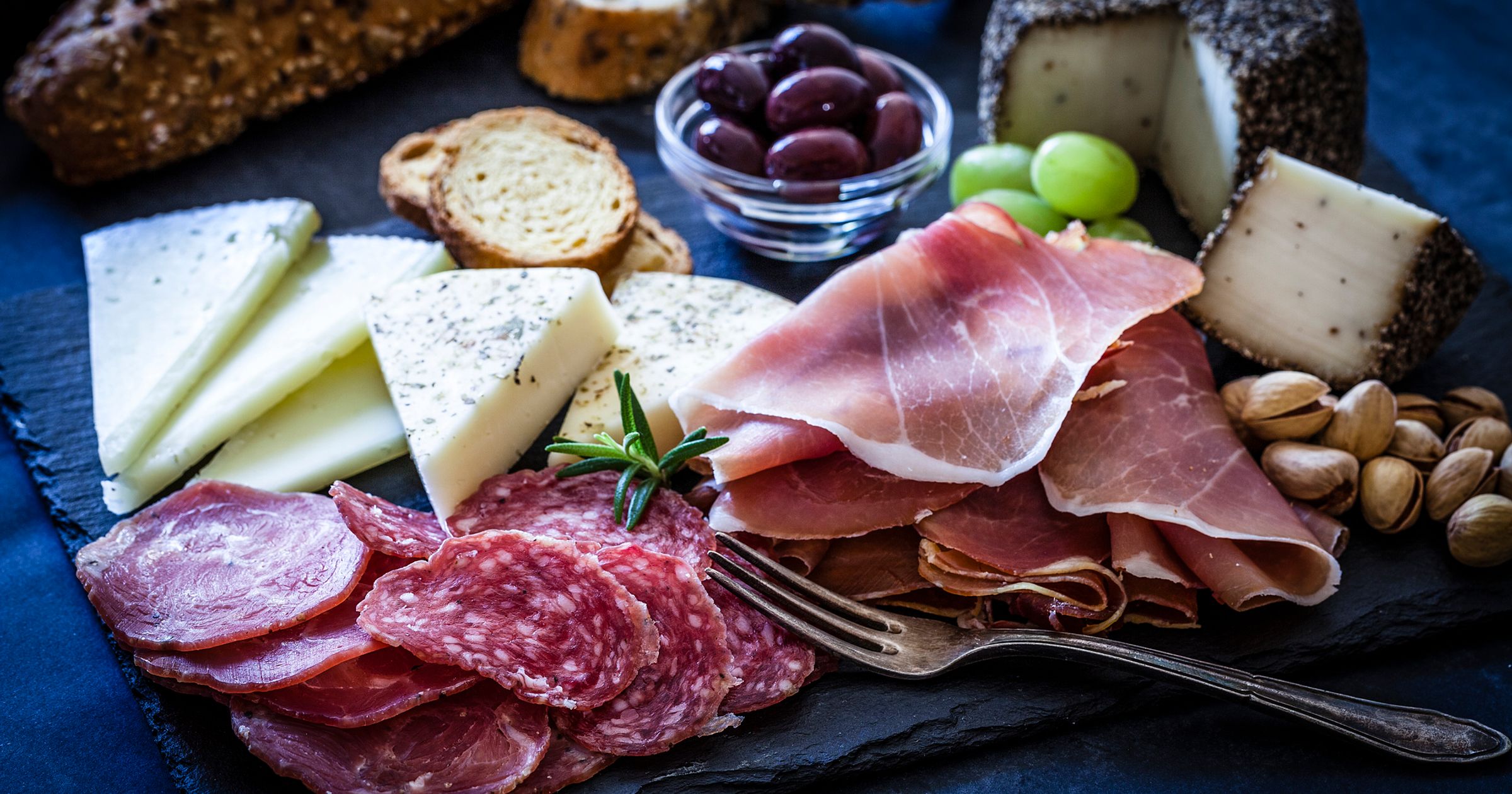 "alt": "Deska serów i mięs, przystawka na kolacje z przyjaciółmi",