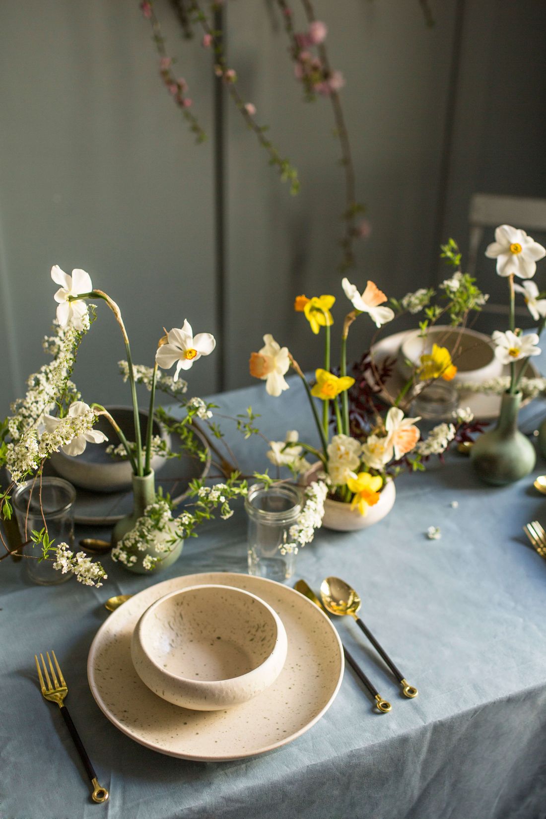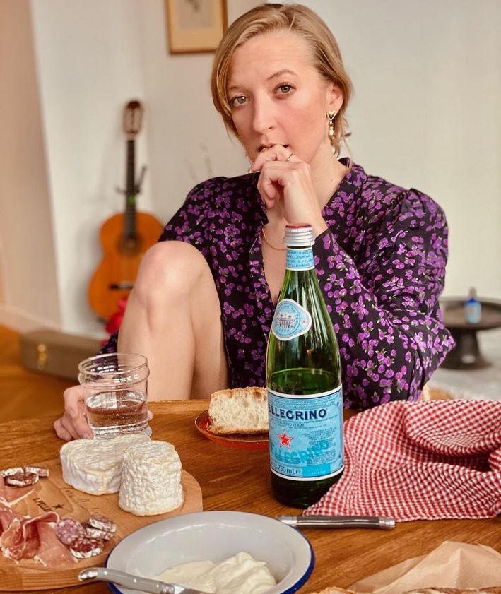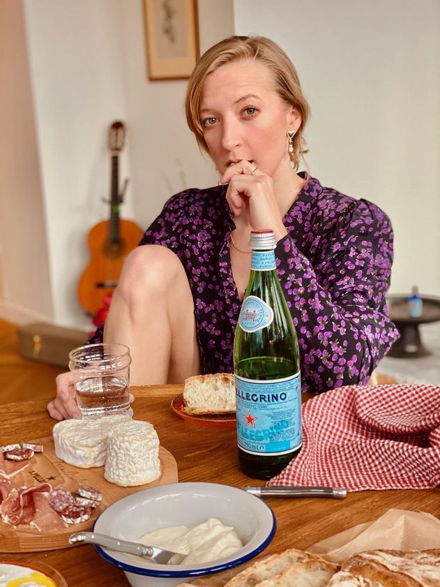 "alt": "Lara Gessler przy stole z deską serów i butelką wody",