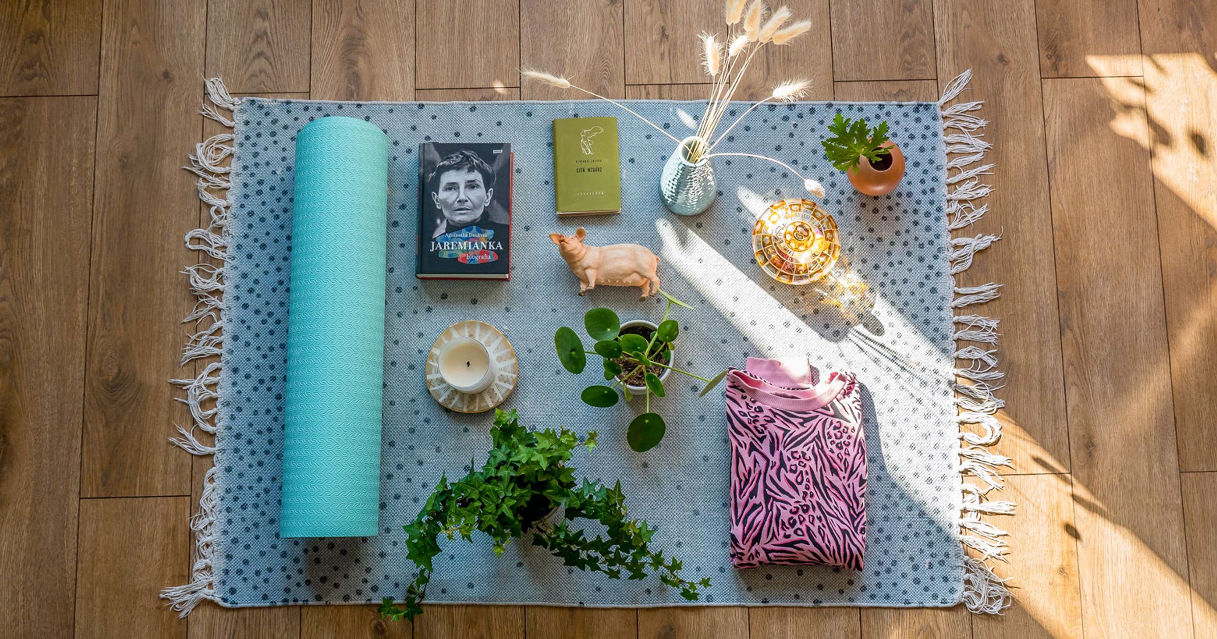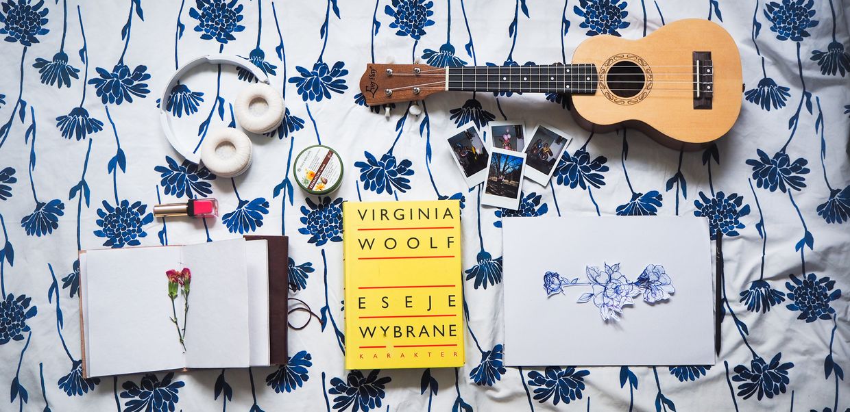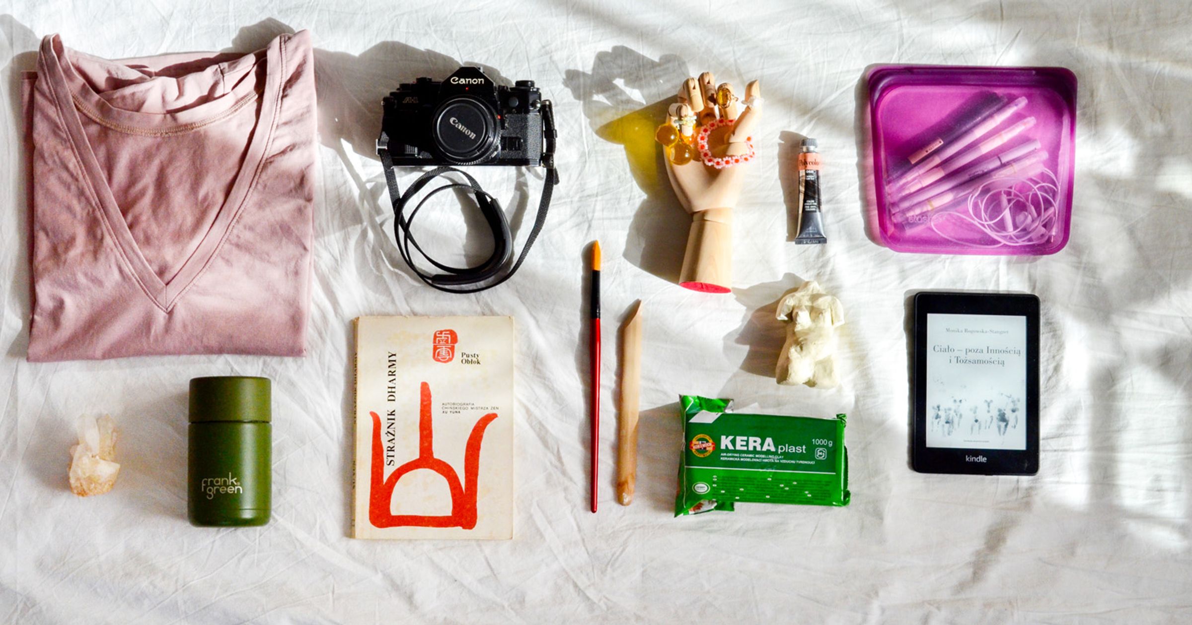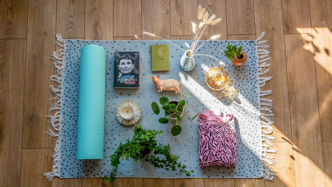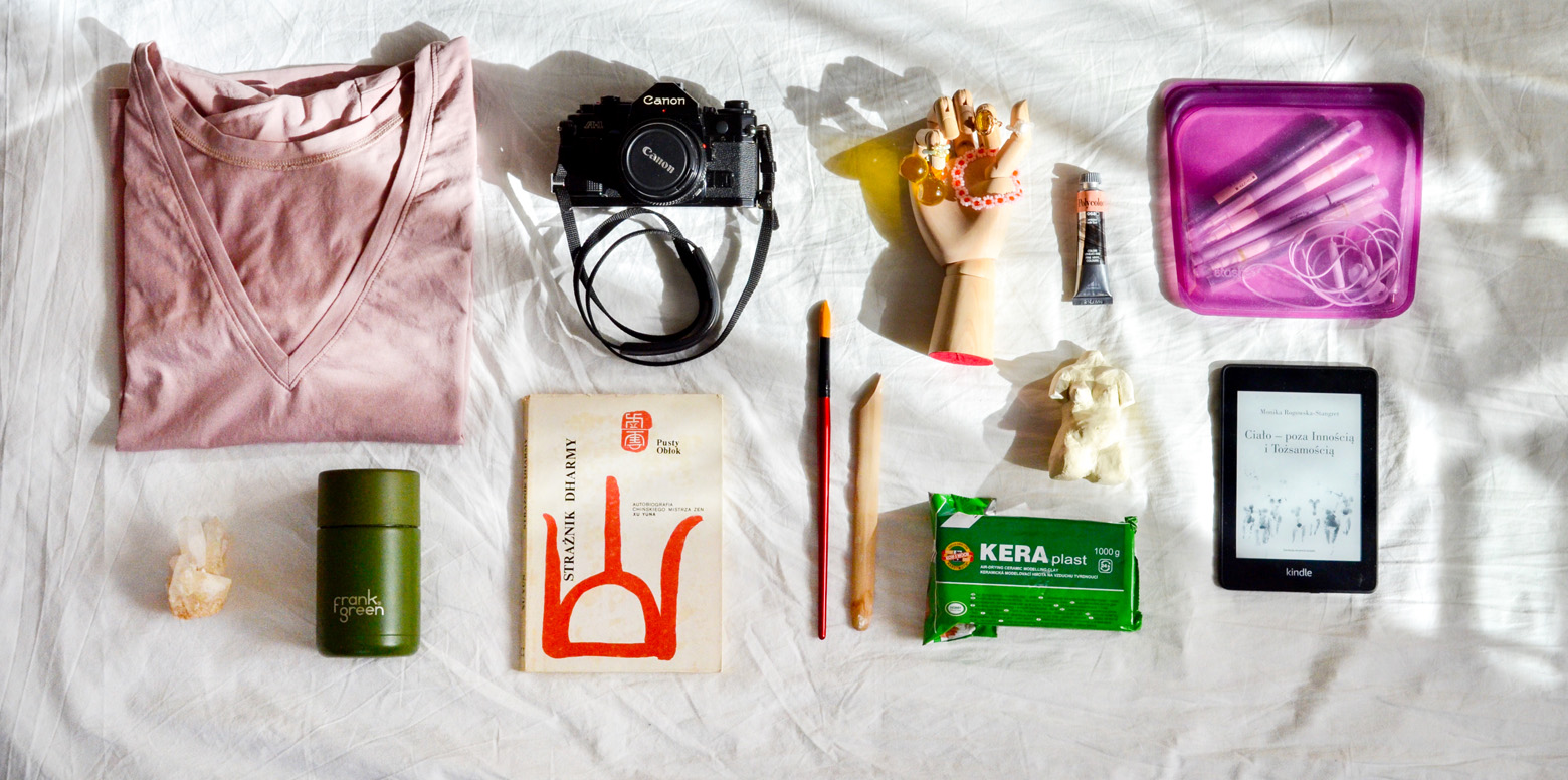 "alt": "Różne przedmioty takie jak książki, zakładki do książek i szczotki do ciała (fot. Ola Koperda)",