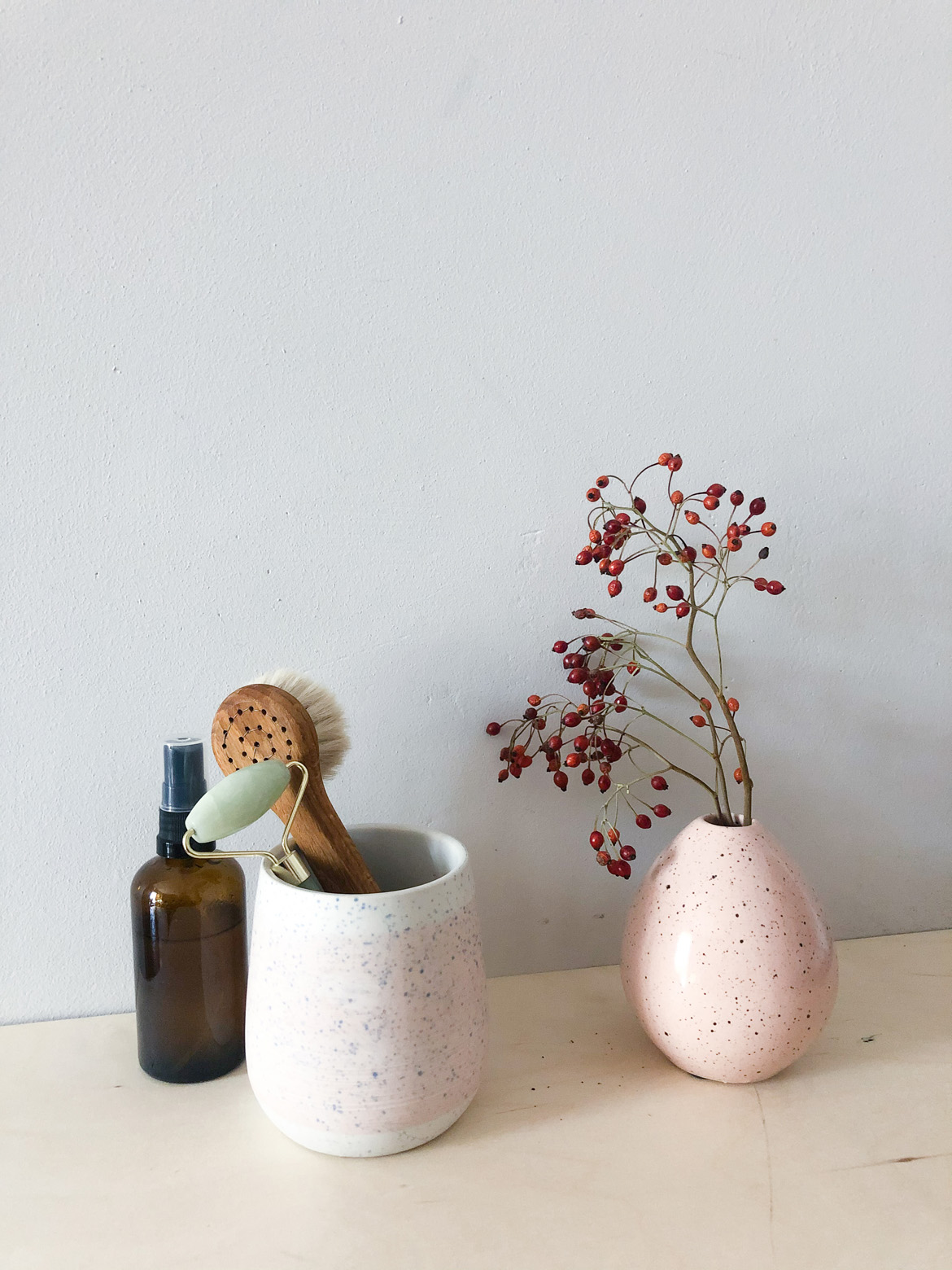 "alt": "Różne przedmioty takimi jak szczotki do ciała, serum i roller do twarzy (fot. Ola Koperda)",