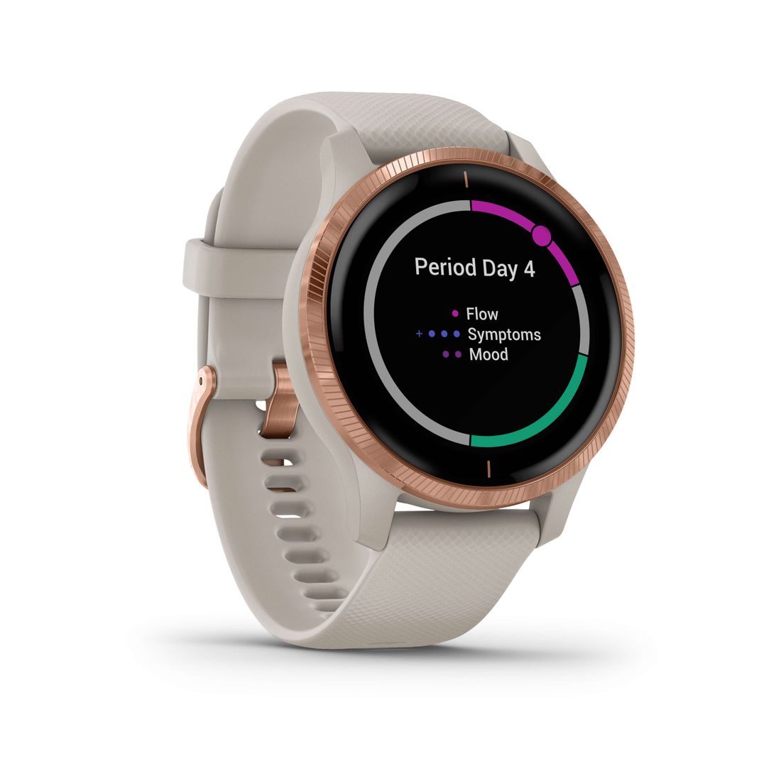"alt": "Złoto beżowy zegarek Venu z funkcją kalendarza cyklu menstruacyjnego",