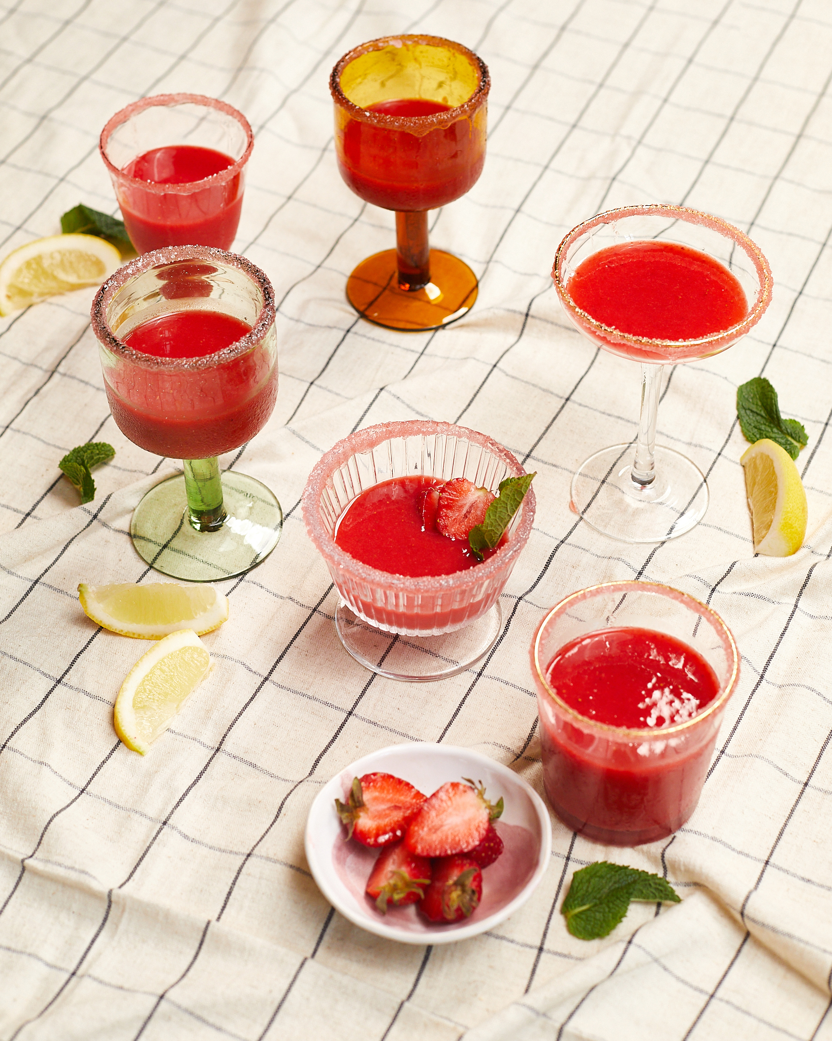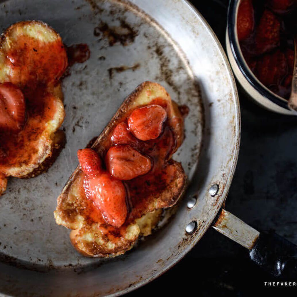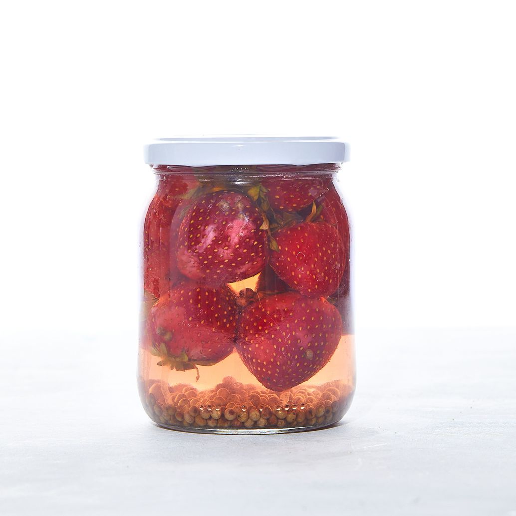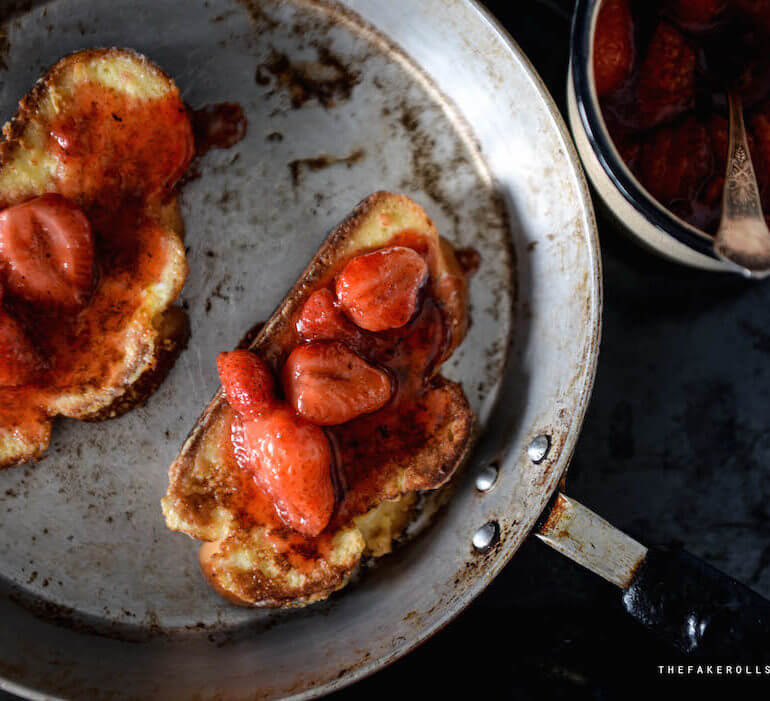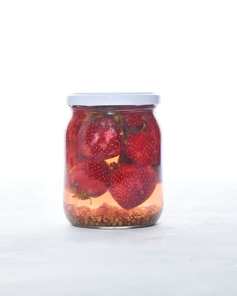 "Kroimy truskawki. Umieszczamy w garnku razem z cukrem i gotujemy na małym ogniu, aż puszczą sok i zmiękną. Przecedzamy ugotowane truskawki przez sitko, aby uzyskać czysty syrop truskawkowy. Odstawiamy do ostygnięcia.",