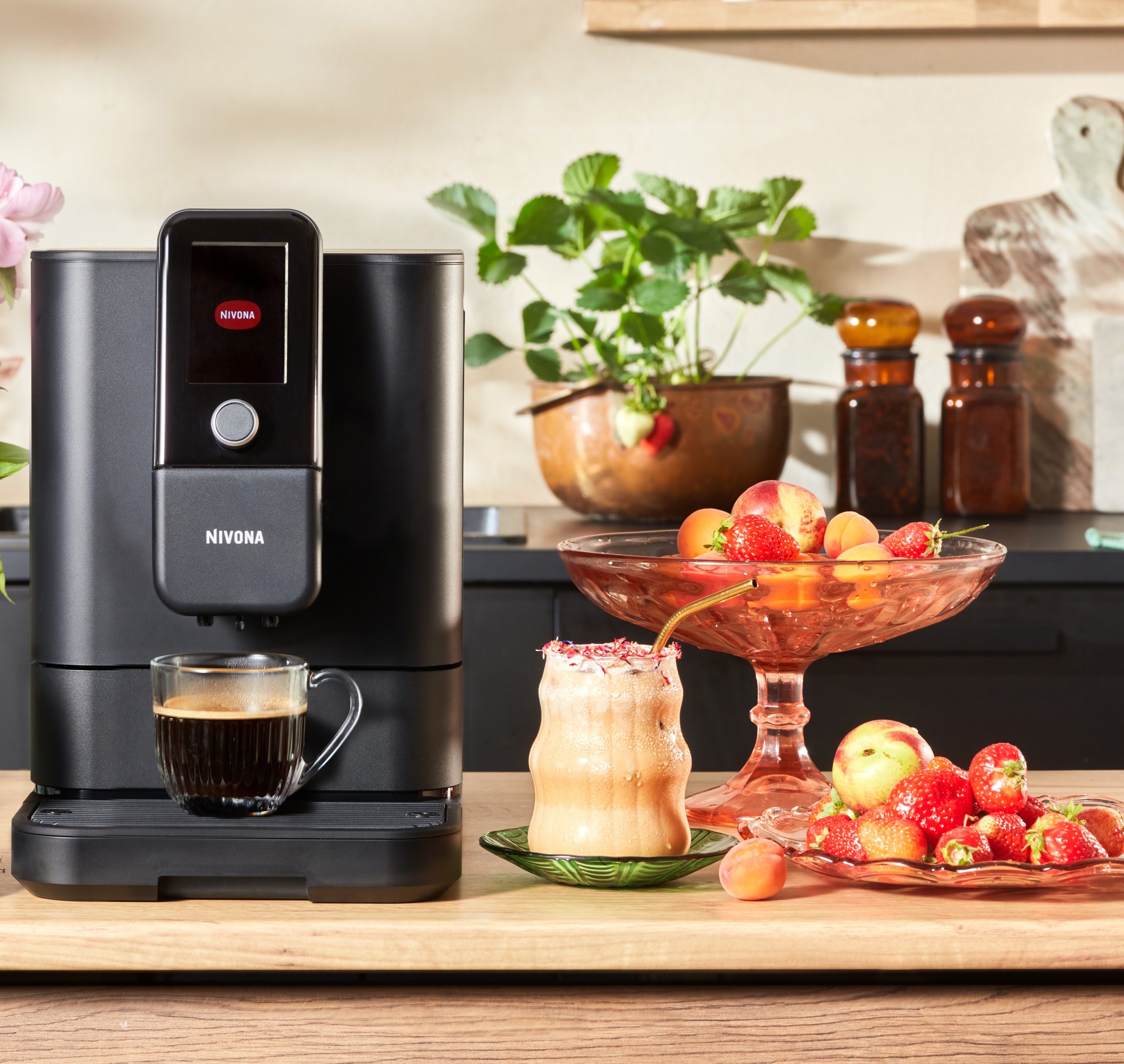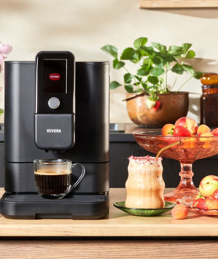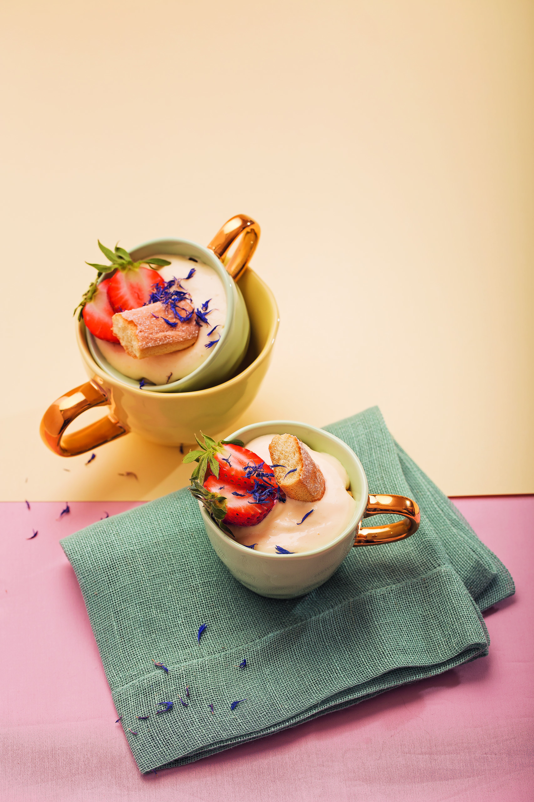 "Ubijamy śmietankę z kilkoma łyżkami syropu truskawkowego, tworząc puszystą piankę. Wlewamy piankę na wierzch kawy. Dekorujemy napój suszonymi kwiatami."