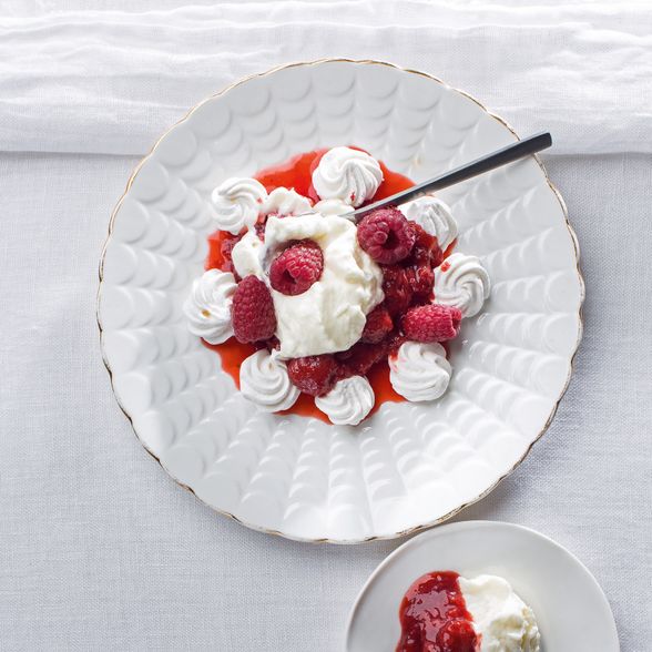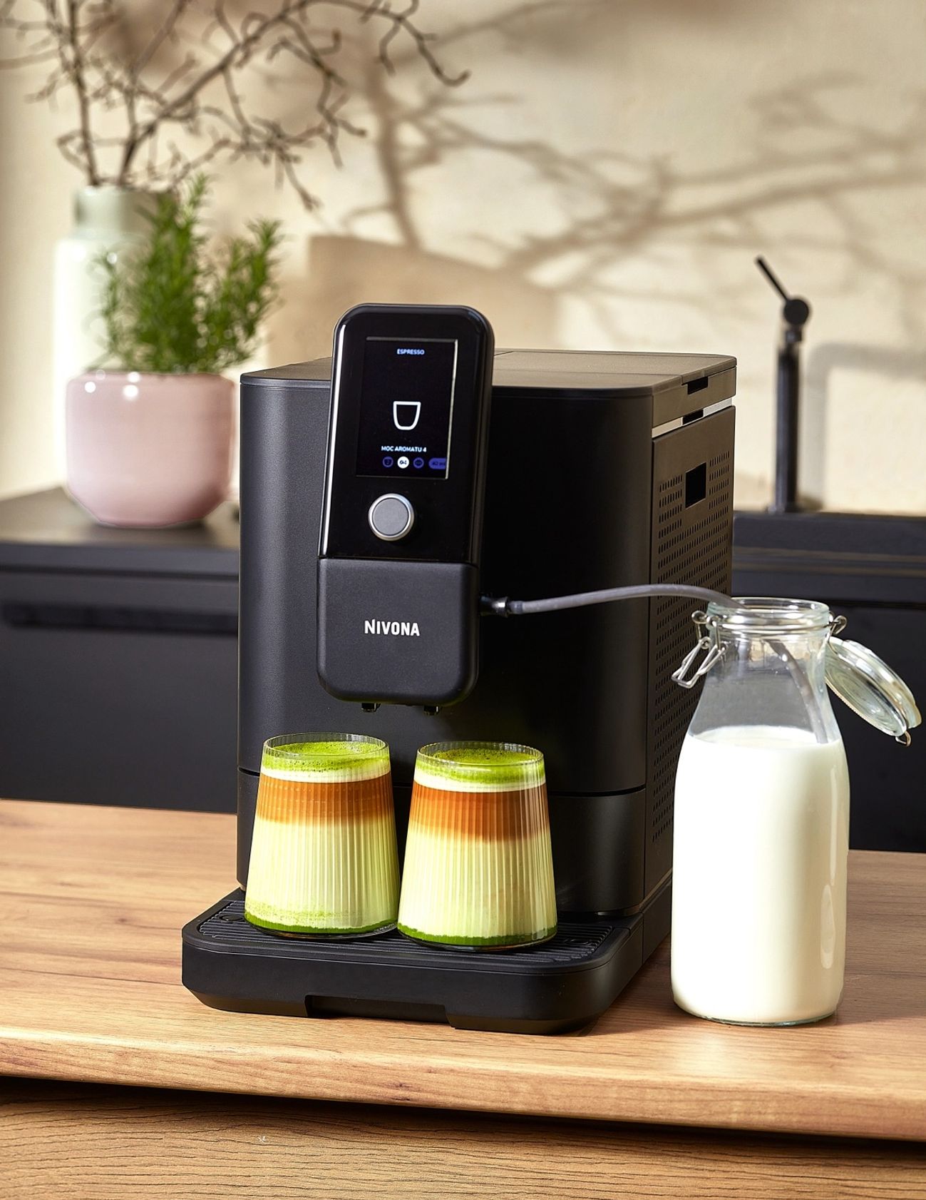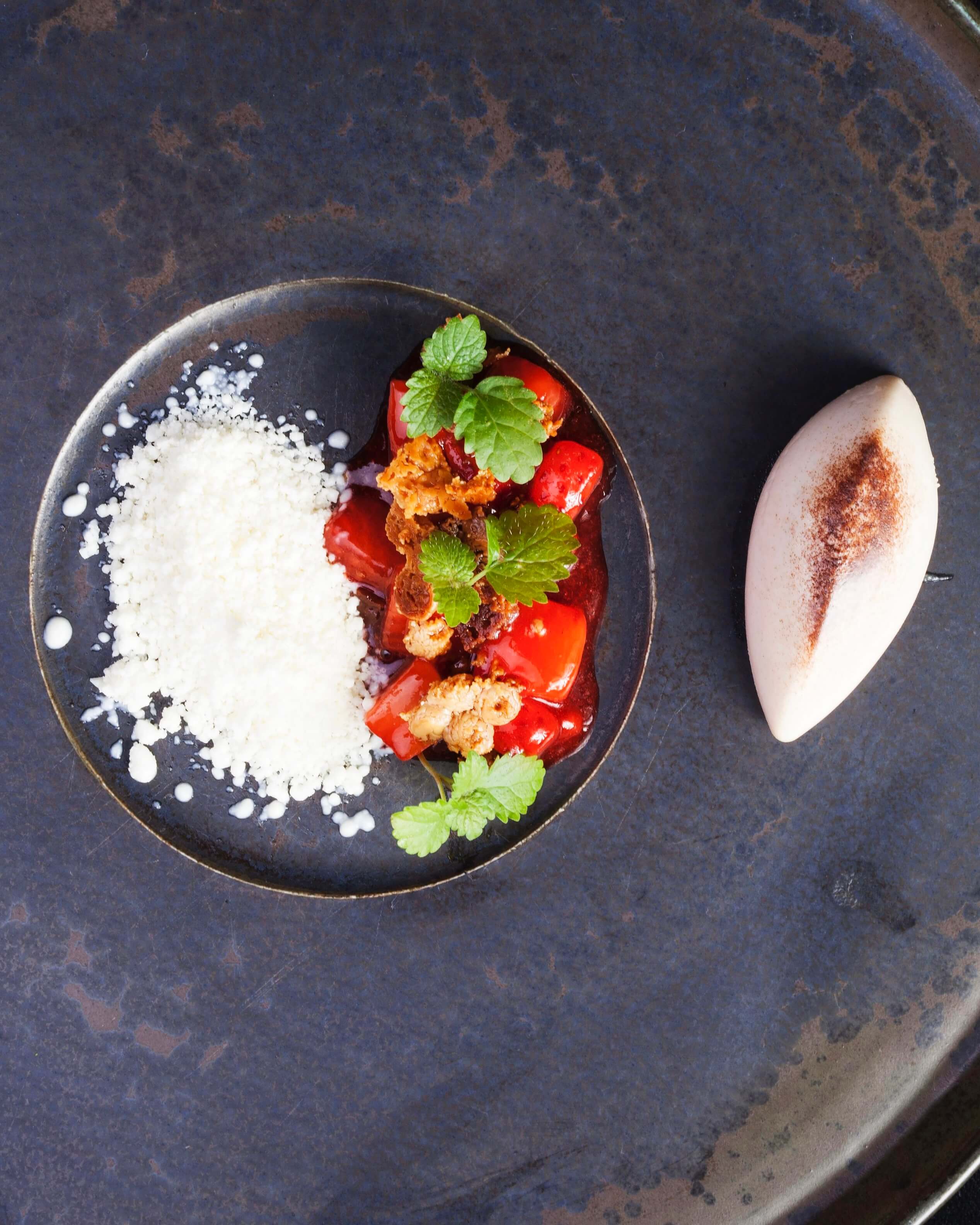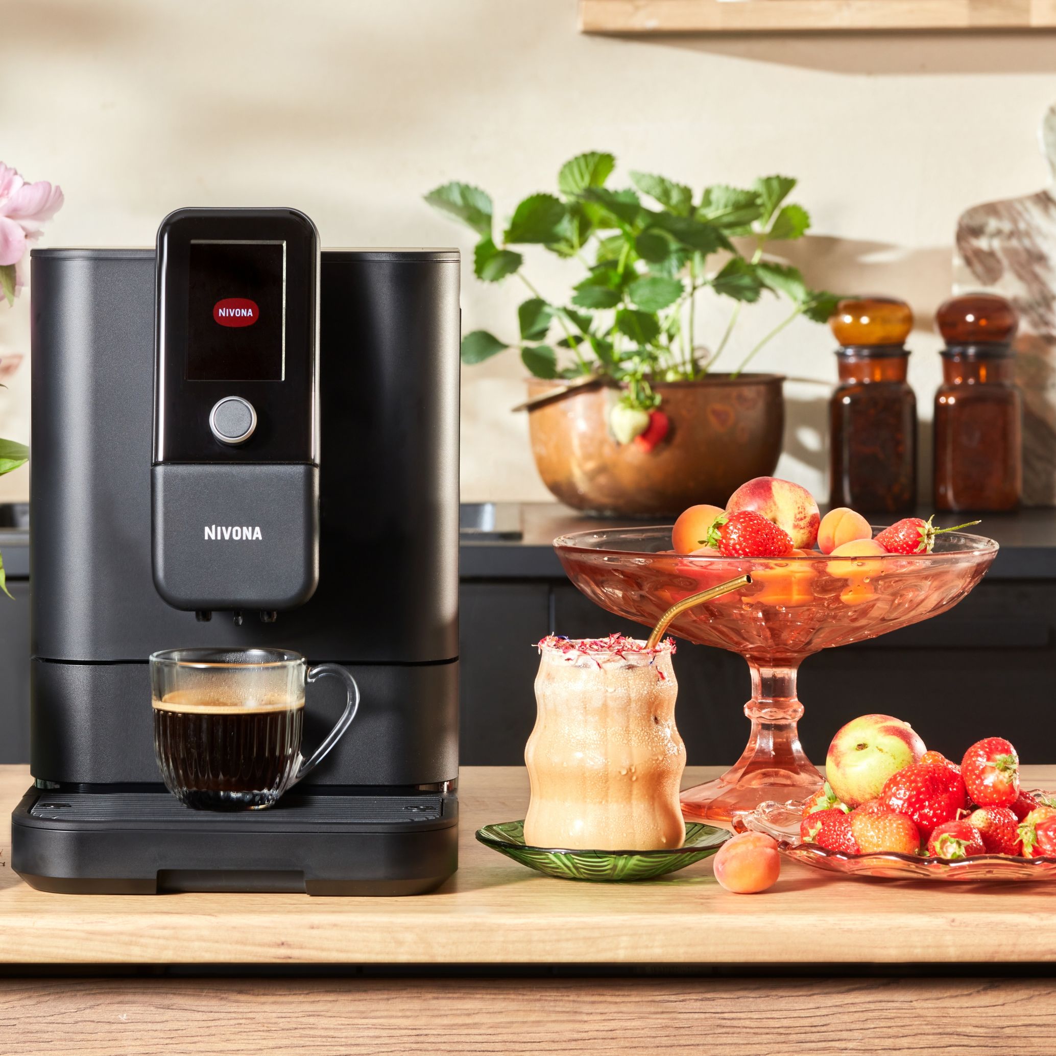 "Ubijamy śmietankę z kilkoma łyżkami syropu truskawkowego, tworząc puszystą piankę. Wlewamy piankę na wierzch kawy. Dekorujemy napój suszonymi kwiatami."