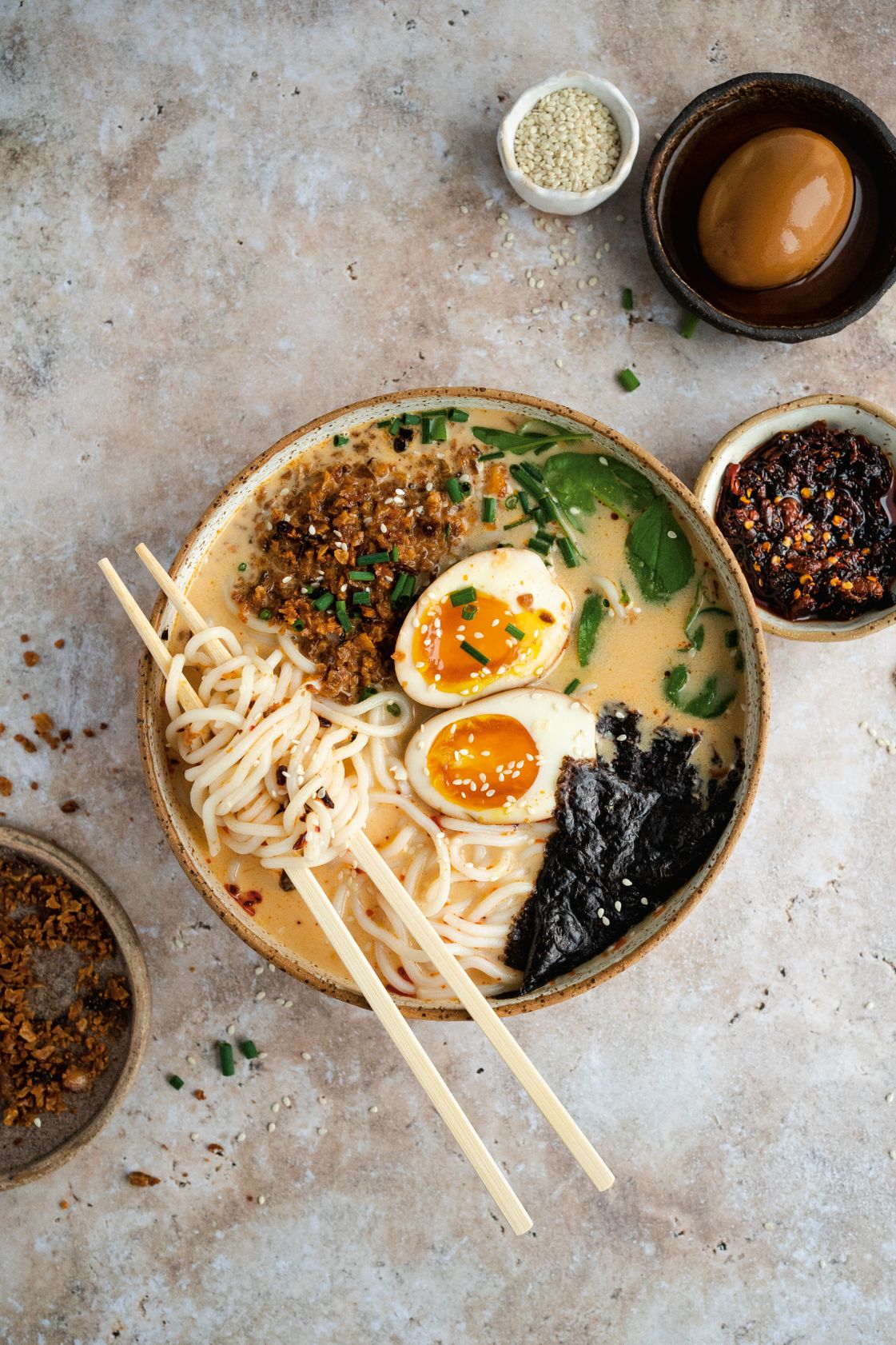 "Do misek nakładamy orzechową bazę, zalewamy ją gorącym płynem, mieszamy. Dodajemy makaron, listki nori lub szpinak, szczypiorek i tofu. Na wierzch kładziemy przepołowione zamarynowane jajko, a całość posypujemy sezamem."