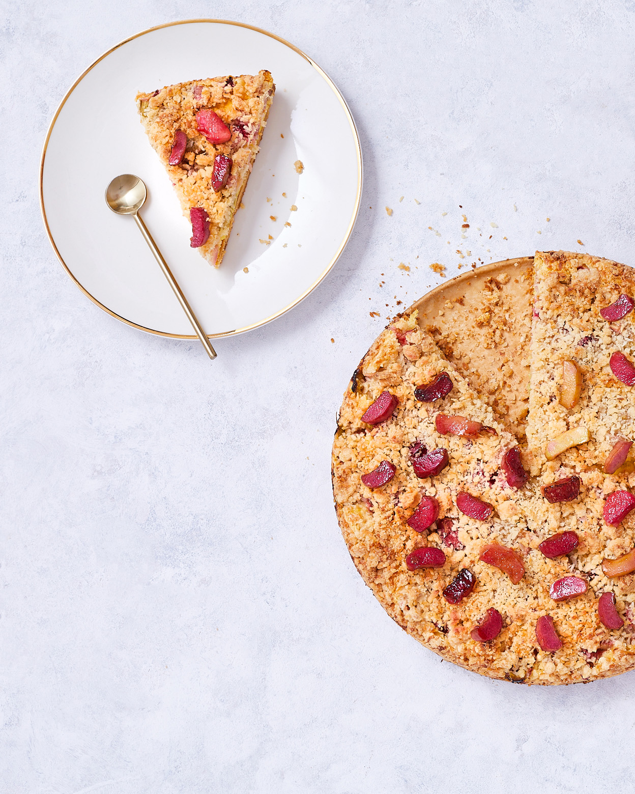 "alt": "Ciasto z rabarbarem i kruszonką, prosty przepis na szybką tartę rabarbarową (fot. Paulina Czyżewska)",