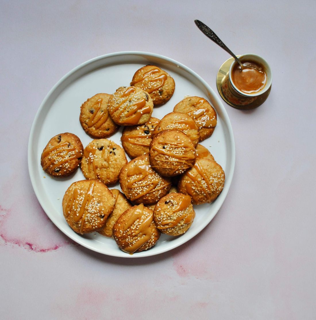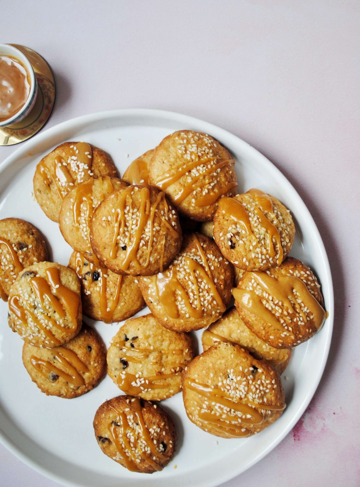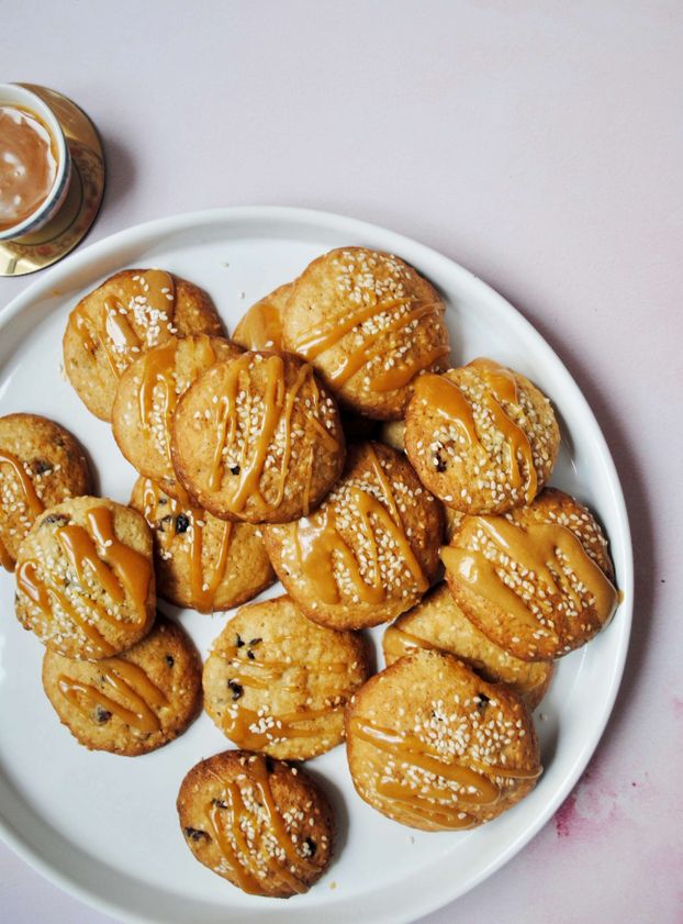 "alt": "bananowo-sezamowe ciasteczka z karmelem, maślane ciasteczka, ciasteczka bananowe, ciasteczka z karmelem, domowy karmel, słony karmel, ciasteczka z tahini, przepis Marta Mankiewicz",
