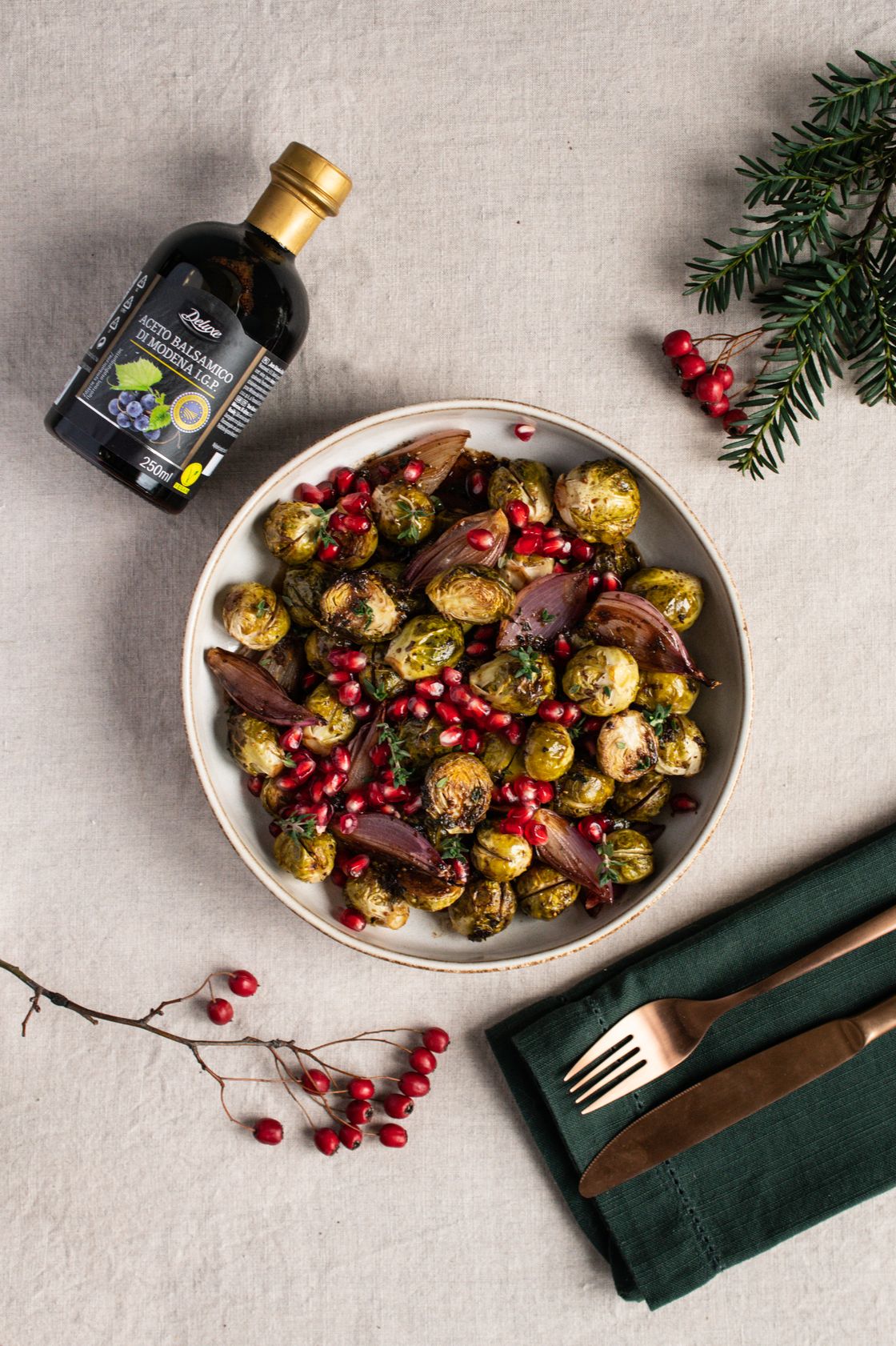 "title": "Pieczona brukselka z octem balsamicznym, parmezanem i granatem",