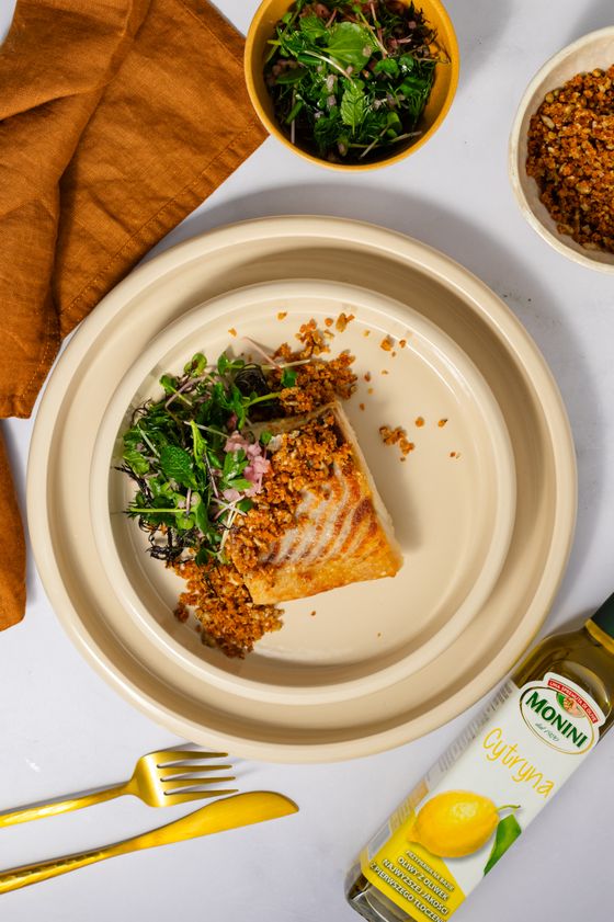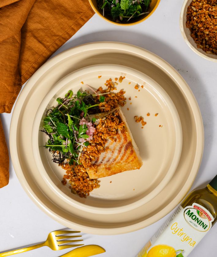"title": "Smażony filet z dorsza z sałatką ziołową i kruszonką z oliwą cytrynową",
