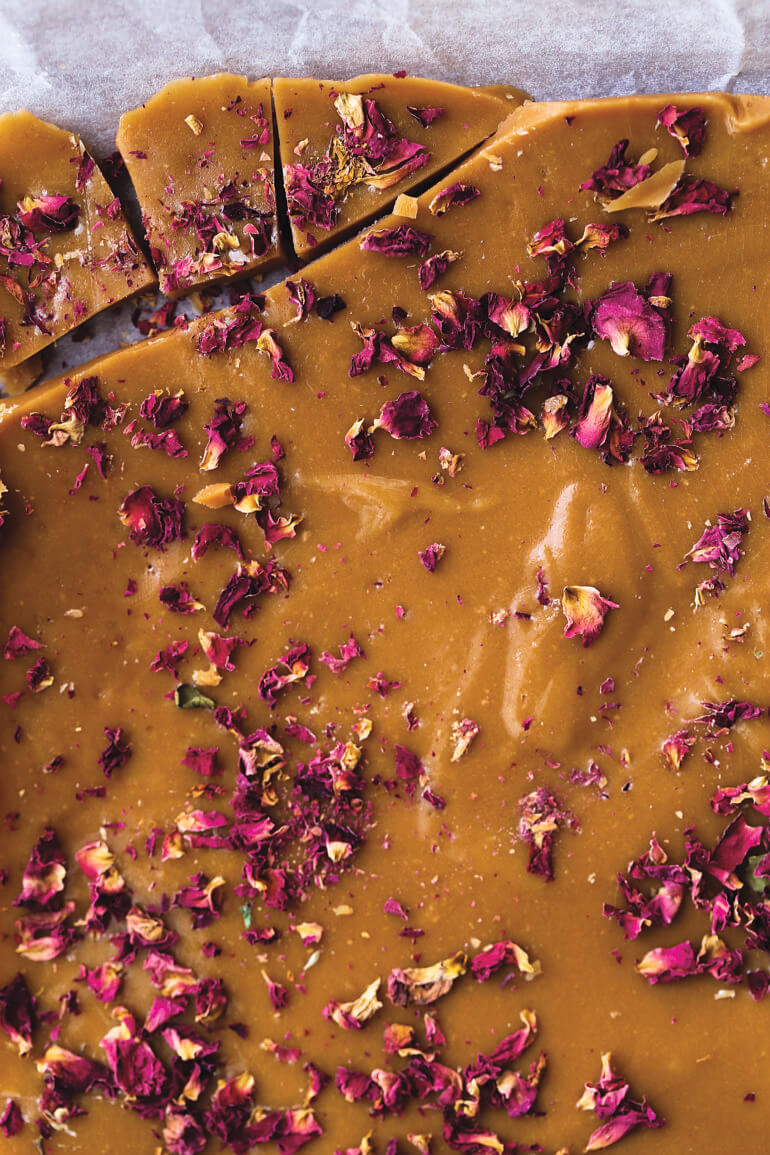 "content": "<p>Masę przelewamy do wyłożonej papierem formy, posypujemy płatkami róży lub/i pistacjami i chowamy na godzinę do lodówki. Dobrze schłodzoną kroimy i zawijamy w kawałki pergaminu.</p>",