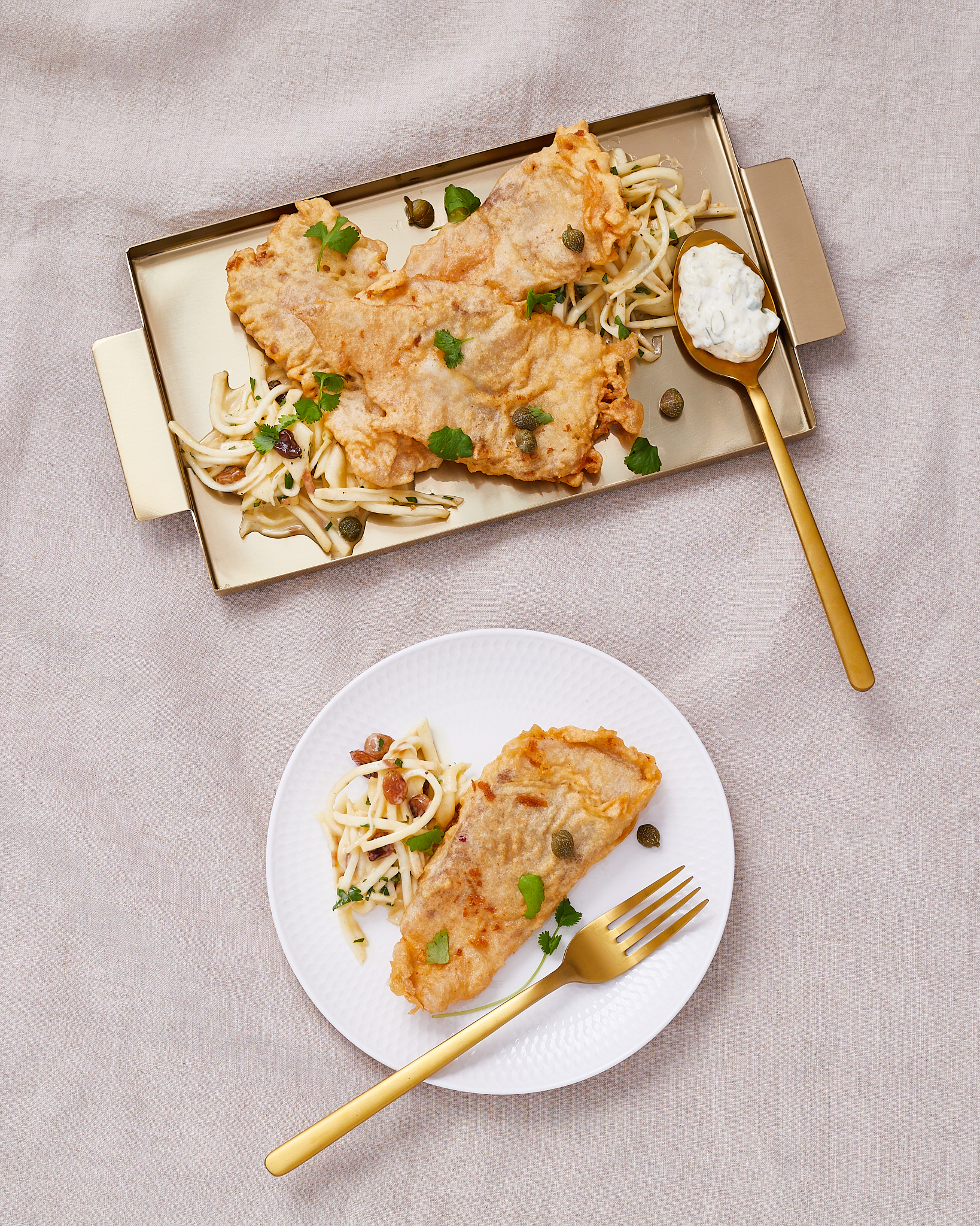 "Schab dzielimy na porcje ok. 170 gramów. Mięso rozbijamy na desce pomiędzy arkuszami folii spożywczej, aż zrobi się bardzo cienkie (prawie przezroczyste). Zdejmujemy folię i panierujemy w mące, jajku rozbełktanym z solą i pieprzem oraz bułce tartej. Panierowanie powtarzamy kilka razy, po drodze otrzepując filet z nadmiaru jajka i bułki.",