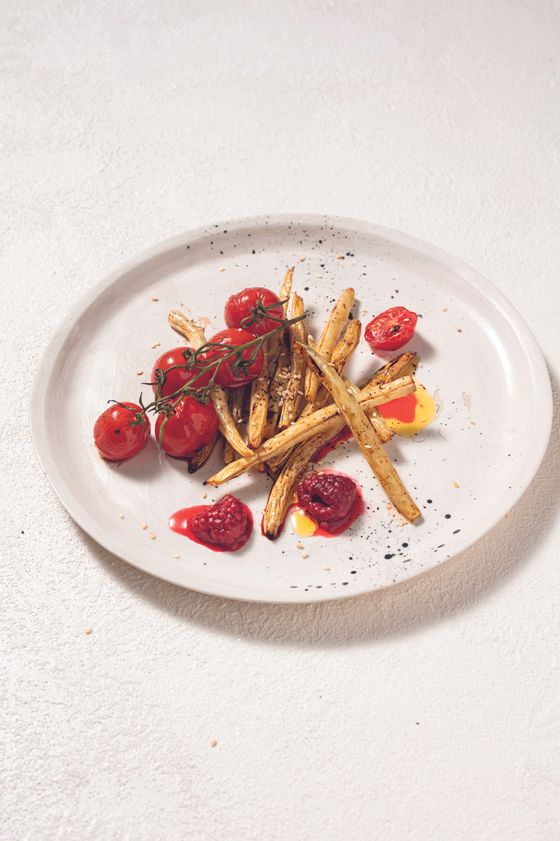 "Natkę marchewki odcinamy – zostawiamy przy korzeniu około 1 centymetra. Marchewki i rzodkiewki przekrawamy na połówki lub ćwiartki, cukinię i kalarepkę tniemy w plasterki, a paprykę w paski. Warzywa wykładamy na blachę, dokładnie polewamy oliwą, układamy na nich tymianek i posypujemy wszystko solą. Pieczemy około 30 minut.",