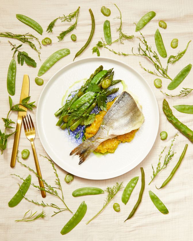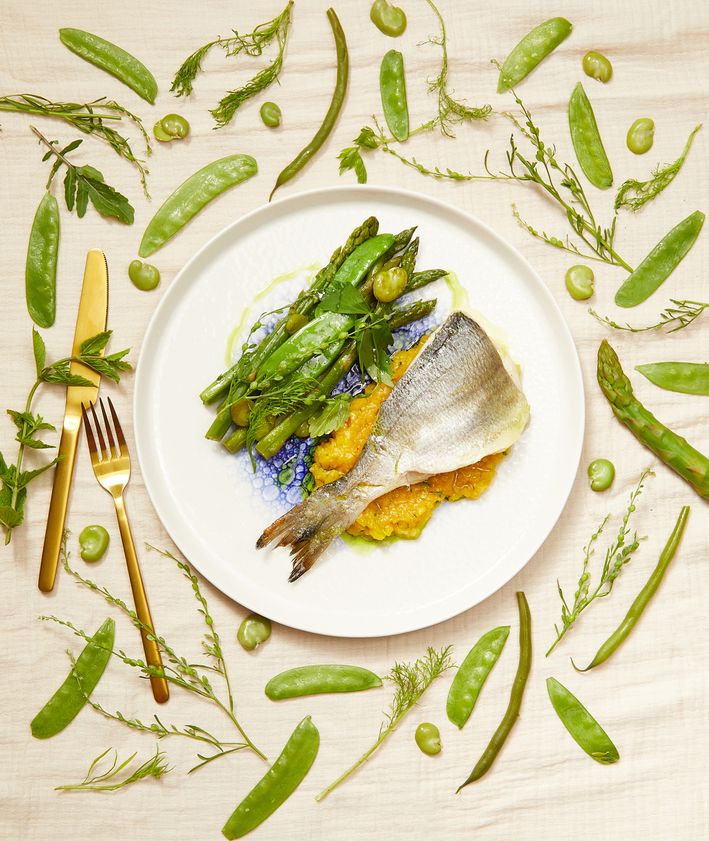 "content": "<p>Fasolkę szparagową, bób i groszek zielony blanszujemy osobno w lekko osolonej wrzącej wodzie – każdy składnik trzymamy w niej około minuty. Osuszamy warzywa na ręczniku papierowym, a następnie smażymy na rozgrzanym maśle około 1½ minuty. Kiedy warzywa się usmażą, doprawiamy rybę solą.</p>",