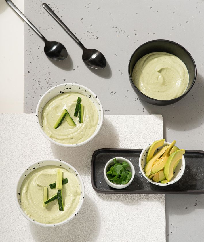 "Awokado kroimy w kostkę, ogórki obieramy. Wrzucamy je do kielicha blendera, dodajemy kolendrę, jogurt lub maślankę i sok z limonki i blendujemy na gładką masę. Doprawiamy solą.",