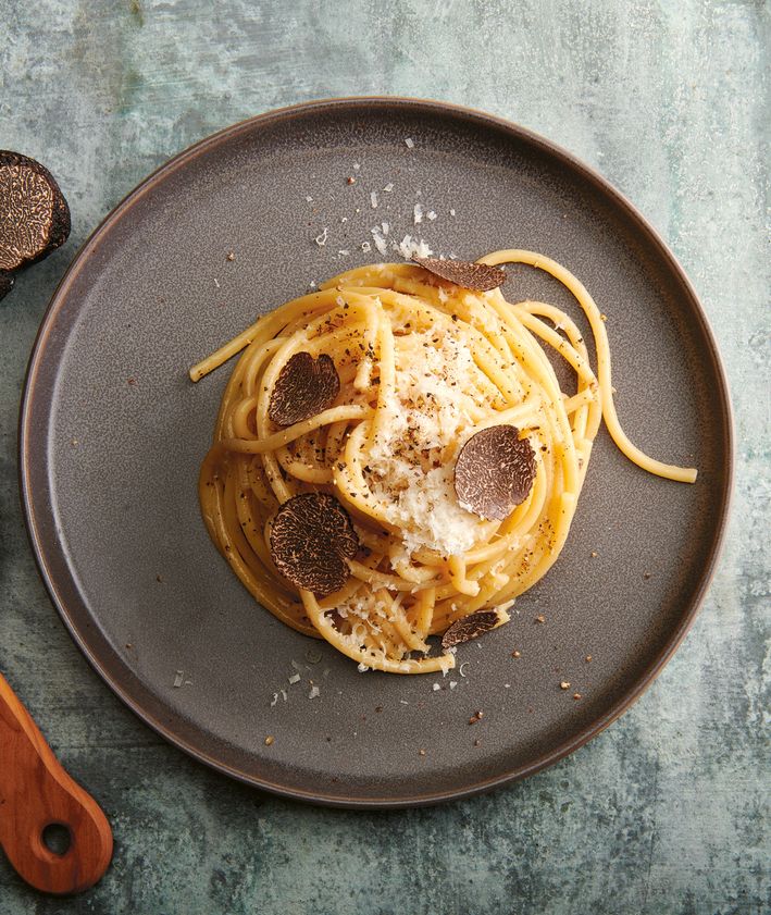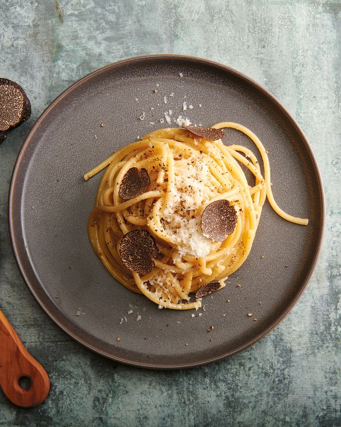 "Przełóż makaron na talerz, posyp startym parmezanem i – jeśli używasz – podawaj z pokrojoną w plastry czarną truflą. Smacznego!"
