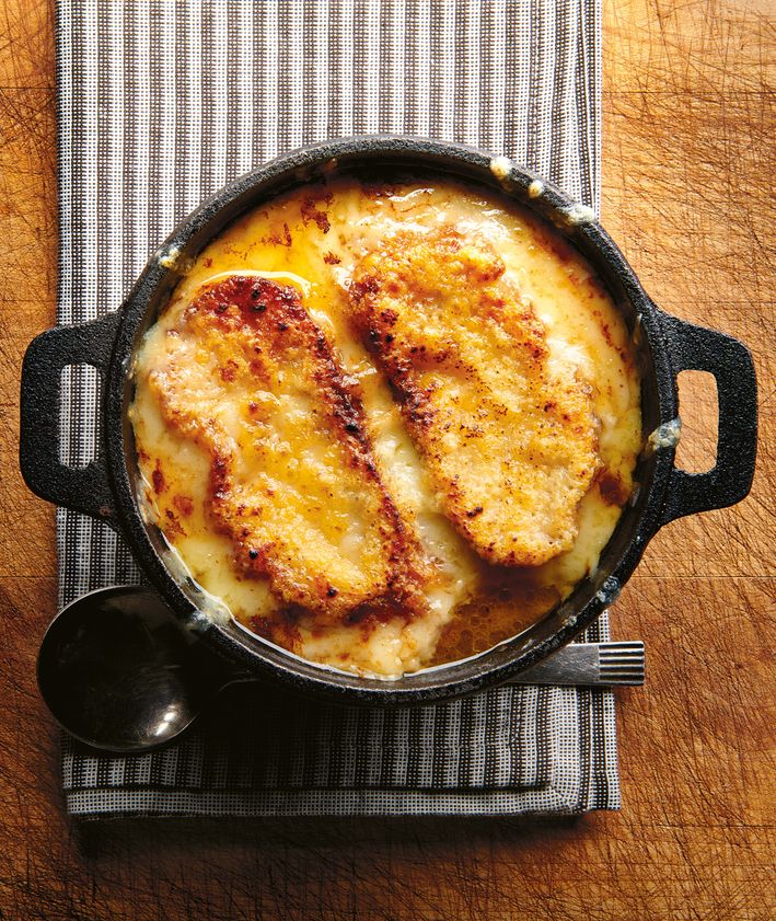 "Jeśli będziesz podawał zupę w zwyczajnych miskach, posyp grzanki serem, rozłóż je na blasze wyłożonej folią aluminiową i włóż do piekarnika w trybie grillowym. Opiekaj do momentu, aż ser się rozpuści. Wlej zupę do naczyń i ułóż na niej grzanki. Podawaj od razu."