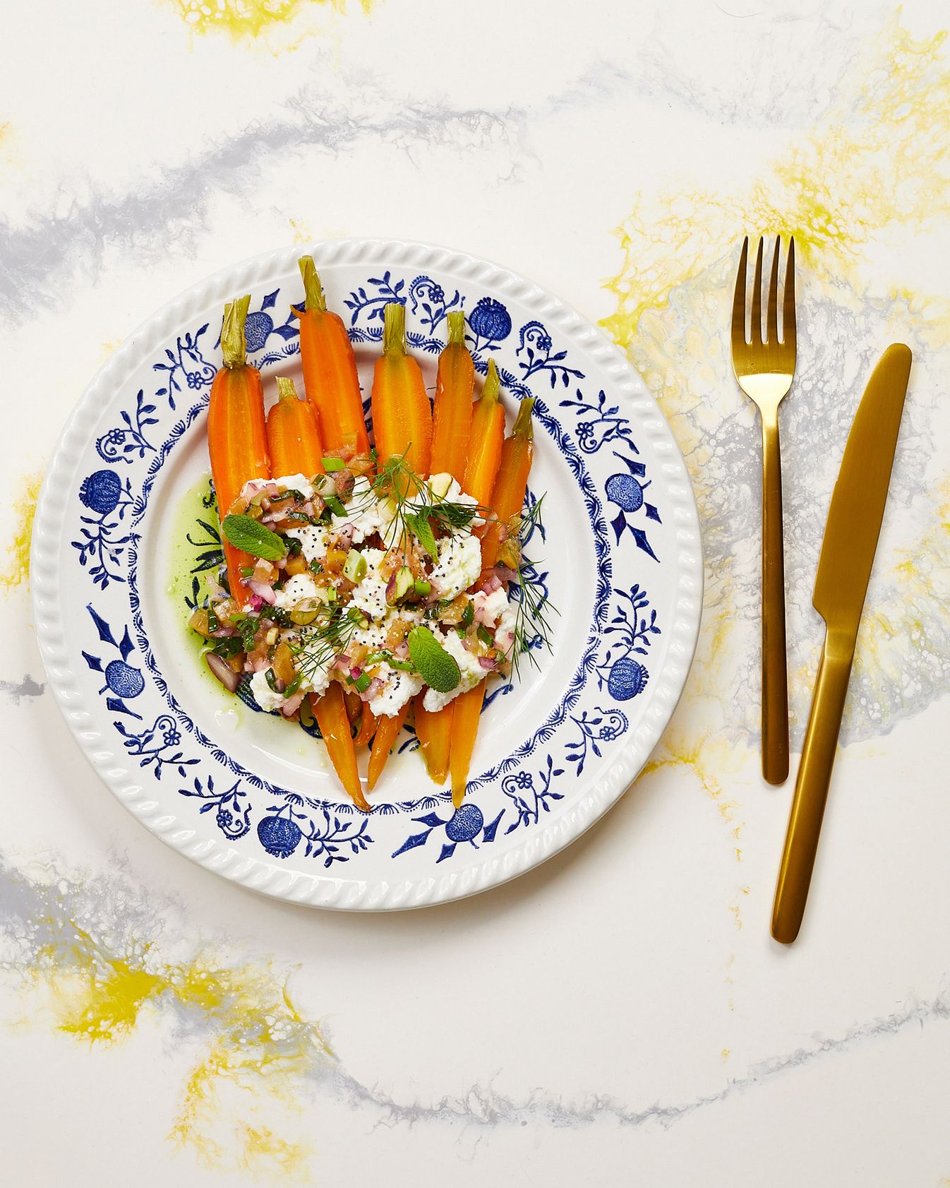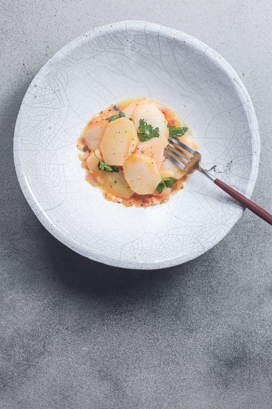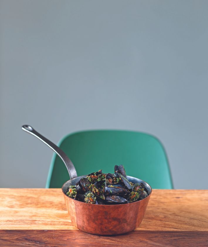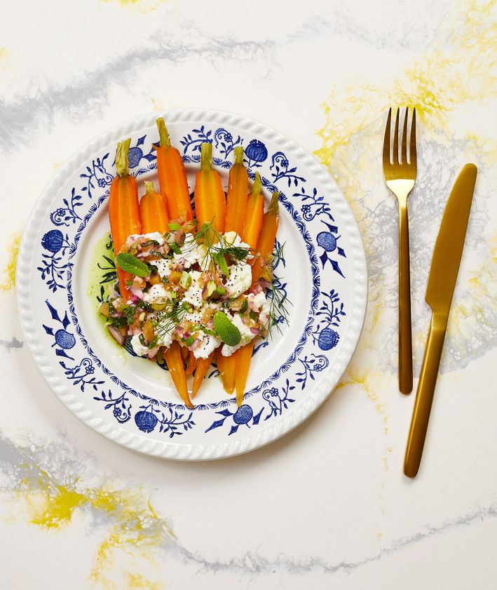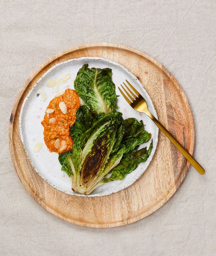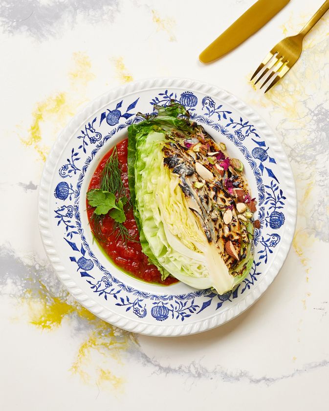 "Kapustę kroimy na ćwiartki, solimy i kładziemy na rozgrzanej suchej patelni. Podsmażamy z jednej strony, aż mocno się skarmelizuje. Kapustę zdejmujemy z patelni, polewamy jej skarmelizowany bok tahiną i wkładamy do piekarnika rozgrzanego do 200 stopni. Pieczemy około 10 minut.",