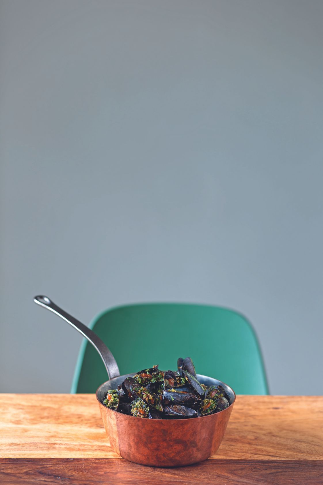 "Szykujemy smakowy olej. Kolendrę i jalapeño siekamy i wkładamy do blendera. Dodajemy olej i sól. Miksujemy na wysokich obrotach do całkowitego rozdrobnienia składników. Olej przecedzamy przez czystą ściereczkę do oddzielnego naczynia.",