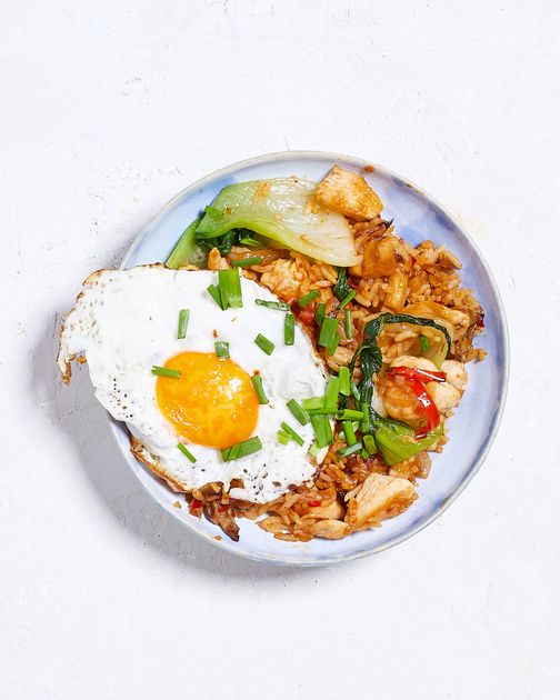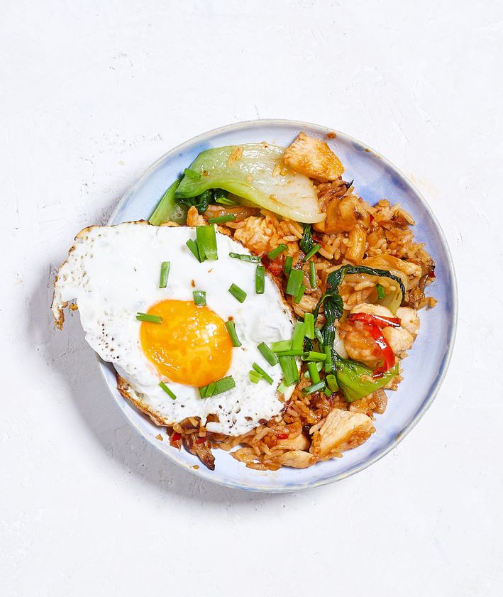 "Smażymy jajko sadzone i kładziemy je na wierzchu dania. Gotowe nasi goreng posypujemy posiekaną dymką.",