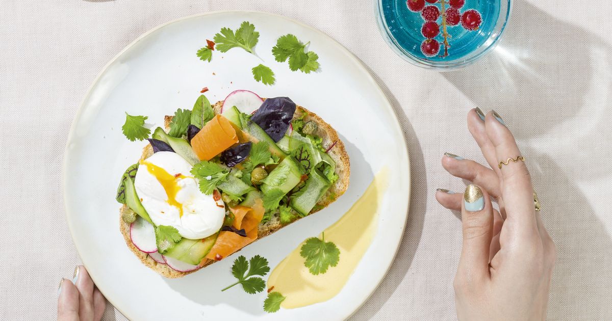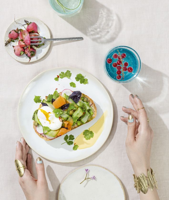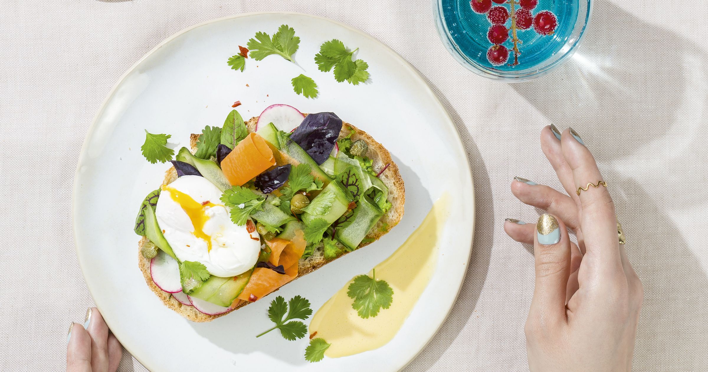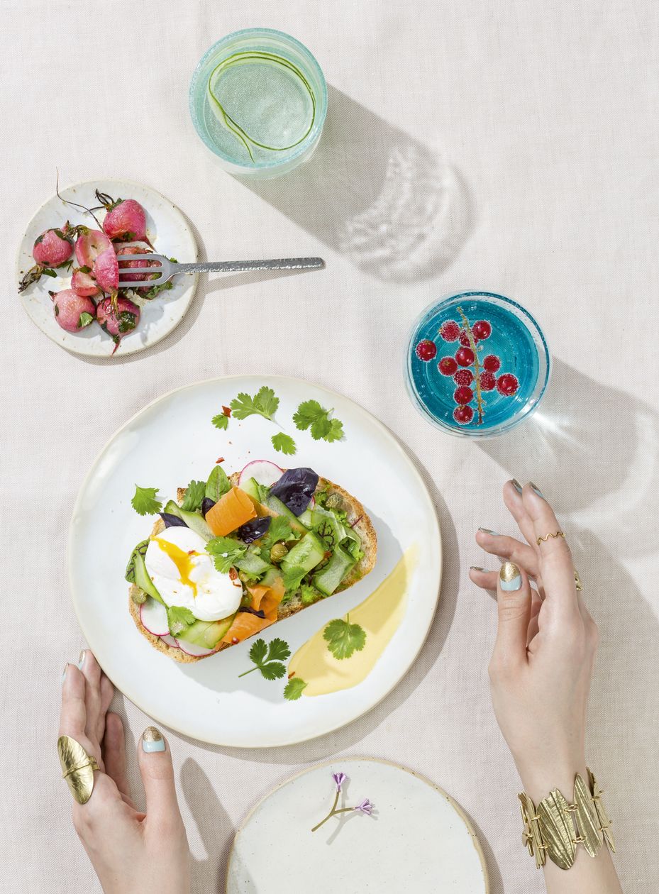 "Kromkę chleba smarujemy grubą warstwą pasty z groszku. Na górę nakładamy plasterki rzodkiewki, wstęgi ogórka i marchewki, jajko w koszulce, kapary i listki ulubionych ziół. Kanapkę polewamy sosem holenderskim. Posypujemy listkami kolendry i płatkami chili. Doprawiamy solą i pieprzem do smaku."