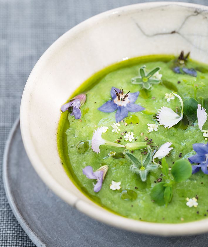 "Groszek blanszujemy. Wszystkie składniki miksujemy w blenderze do uzyskania pożądanej konsystencji. Doprawiamy solą i pieprzem do smaku.",