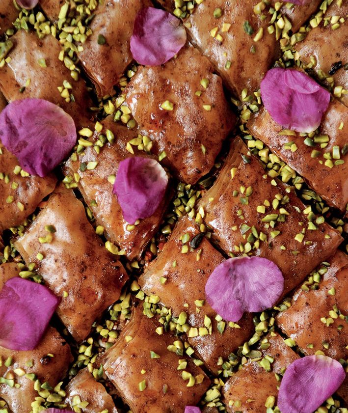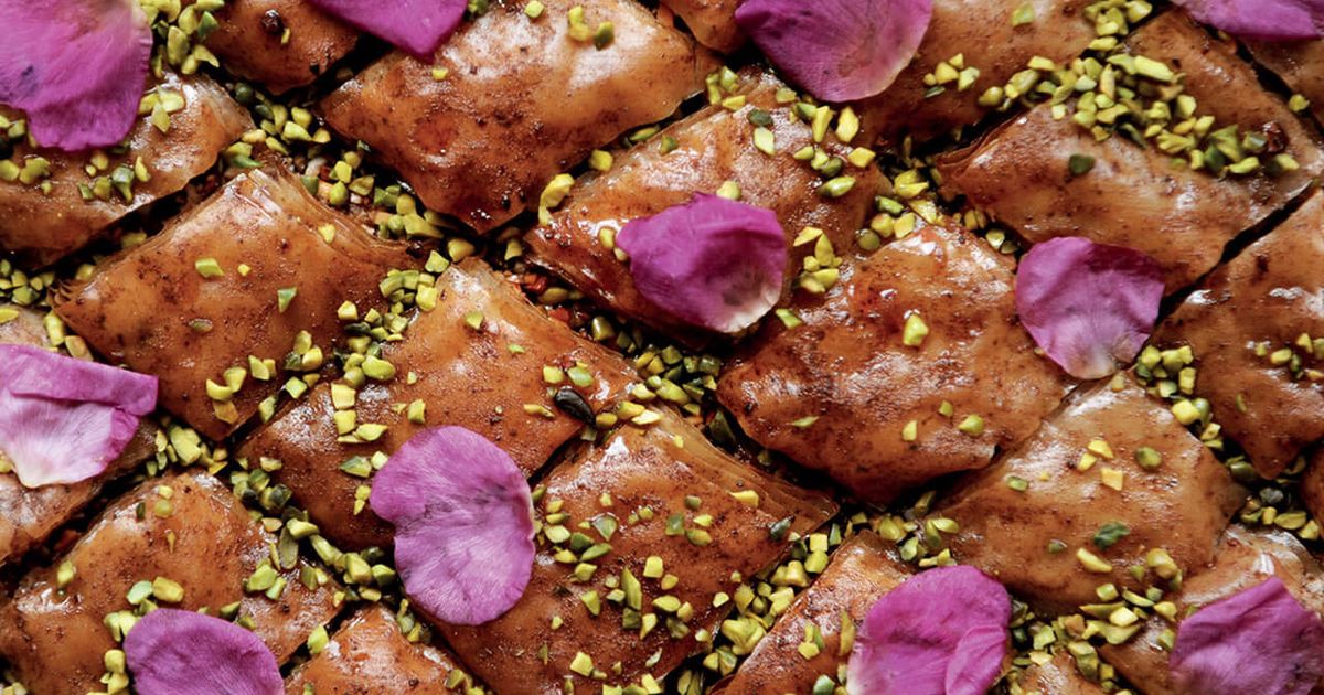 "alt": "Baklava różana z płatkami róży, pistacjami – przepis",