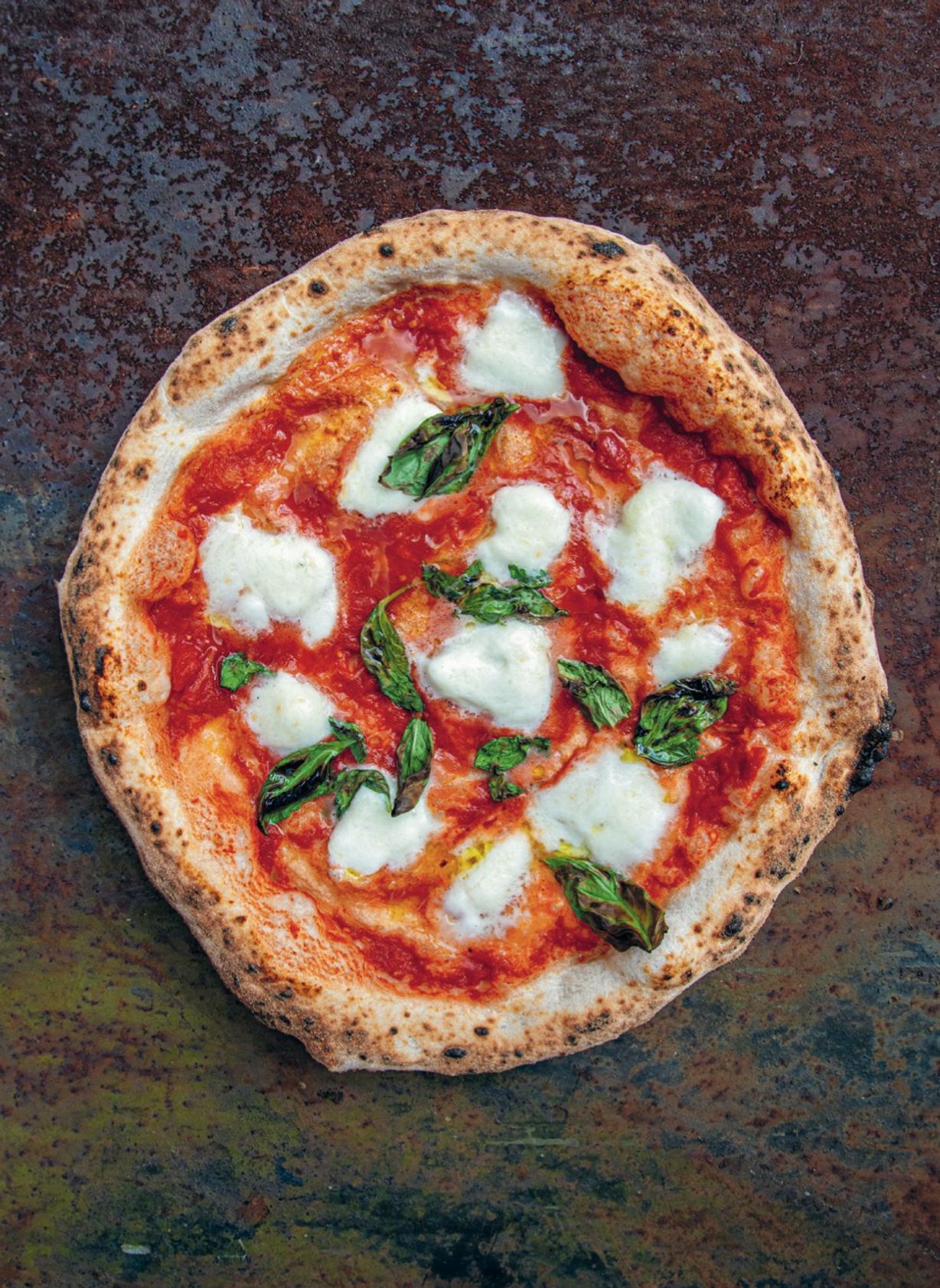 "Odmierzamy porcję sosu i chochelką rozprowadzamy na cieście, zostawiając krawędź suchą. Wykładamy na ciasto 90 g mozzarelli i garść liści bazylii. Skrapiamy oliwą. Przekładamy pizzę na łopatę do pizzy, która po włosku nazywa się pala, i z niej zsuwamy pizzę do domowego pieca do pizzy rozgrzanego do 400 stopni. Pieczemy przez mniej więcej dwie minuty, pilnując, by pizza się nie przypaliła. Po wyjęciu ponownie skrapiamy oliwą.",